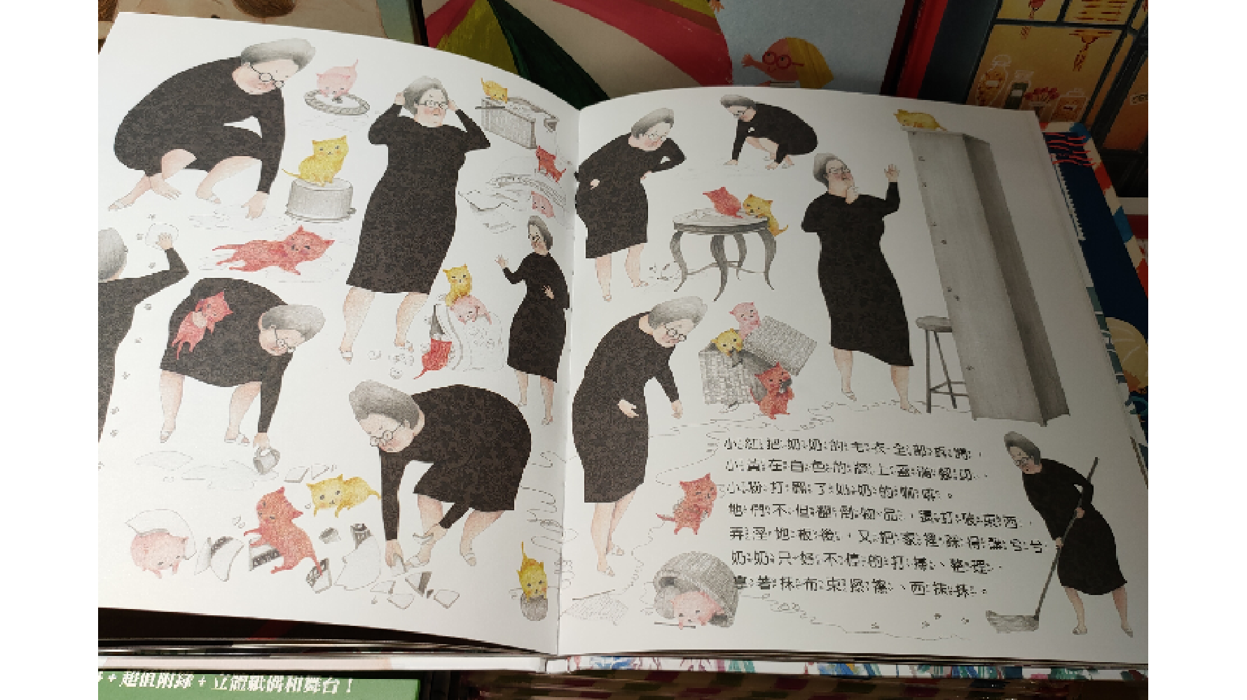有一天,白房子「闖入」了小紅、小黃和小粉3隻小貓,從這天開始,這棟一塵不染的白房子有了180度的大轉變,奶奶整天緊張兮兮地打掃。奶奶雖然一度因生活習慣被小貓攪亂而感到慌張、疲憊、混亂,卻在接納小貓之後,慢慢感受到幸福與趣味。