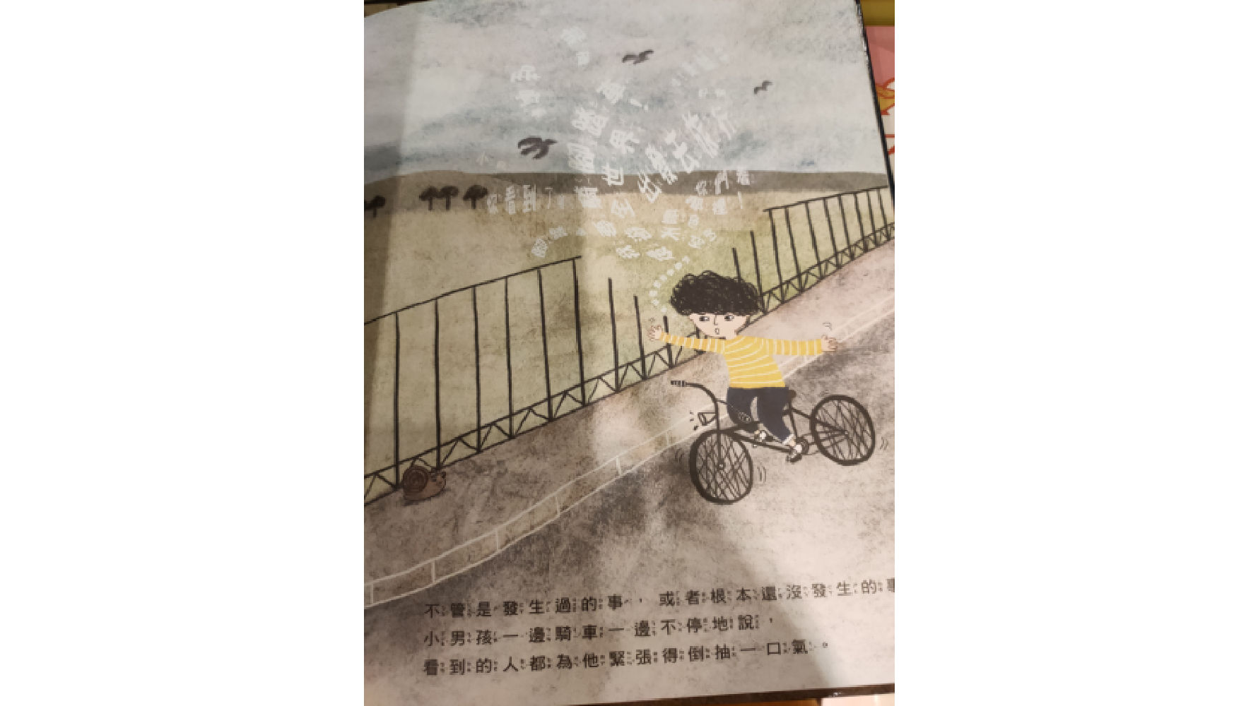 書中的小男孩早上講、晚上也講,騎車時講、夢裡也講,因為不專心走路,連火車經過也沒發現,就算踩到狗大便了,他還是繼續講。大家的耳朵都快受不了了,到底有什麼方法可以讓小男孩的嘴巴停下來呢?