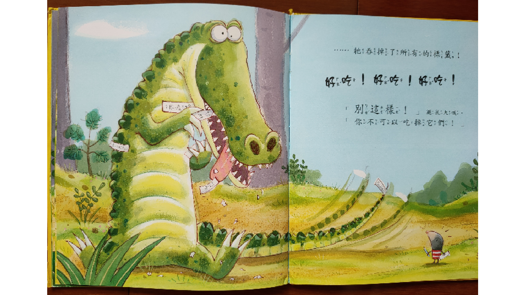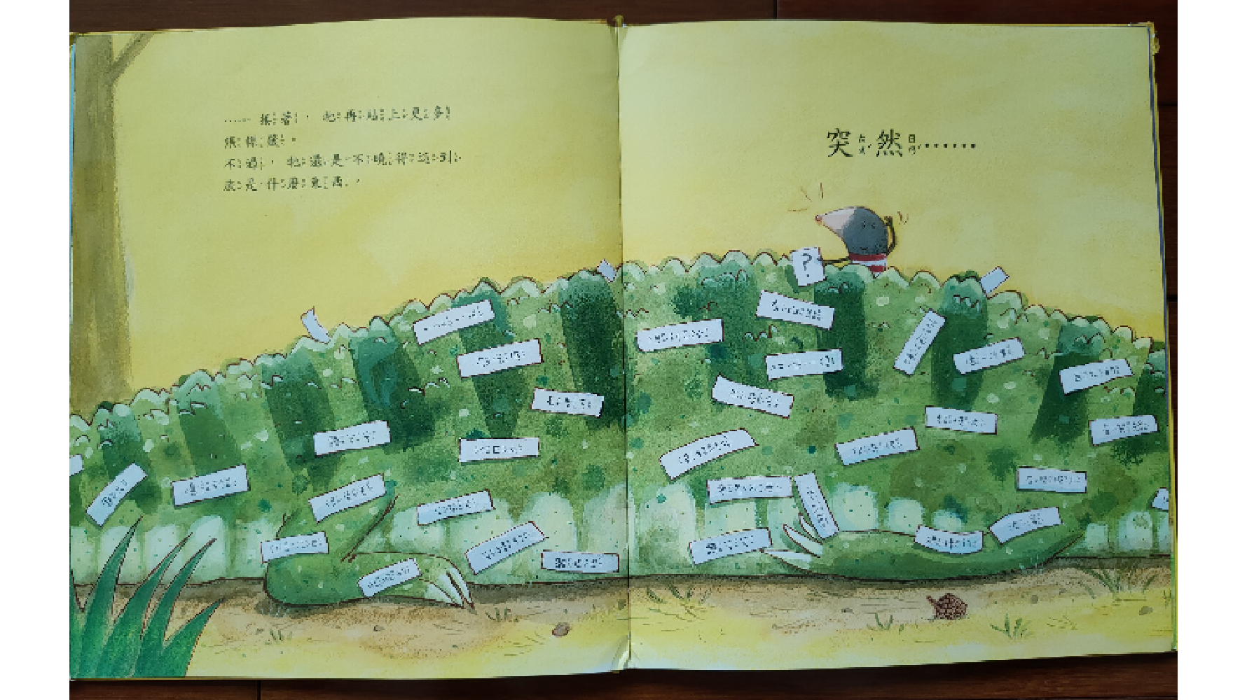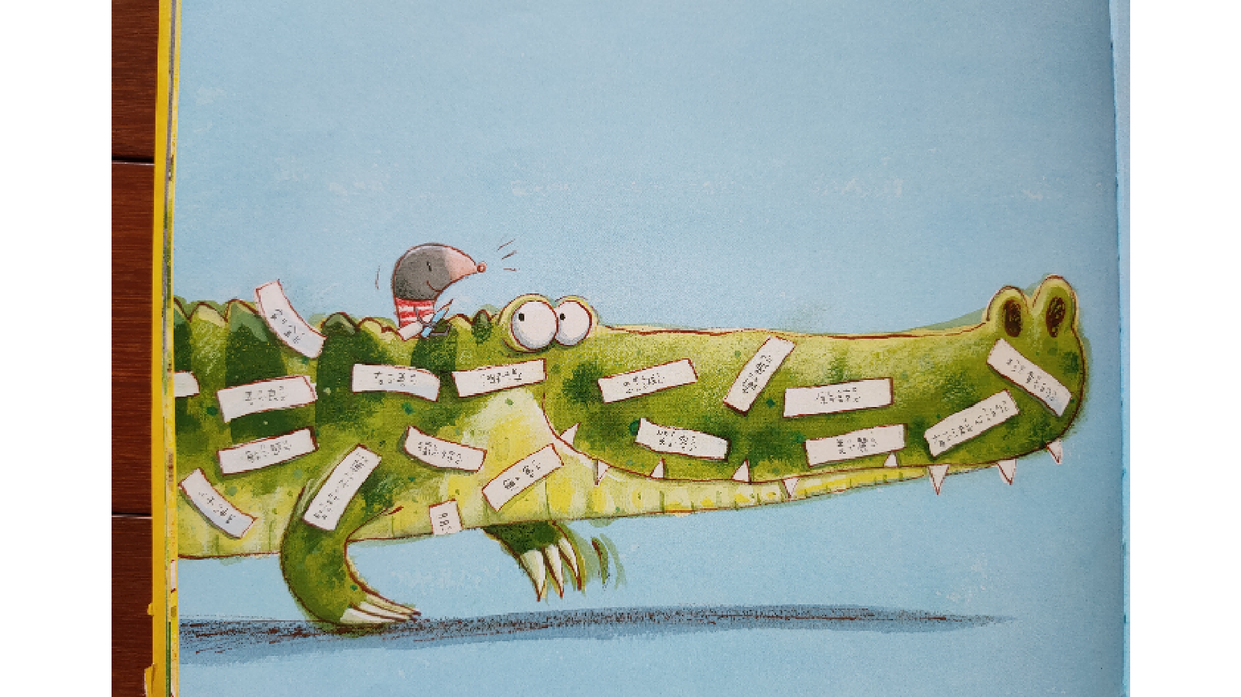 喜歡說八卦,或是對於不明確的事情下了斬釘解鐵的評論,雖無心,卻可能對他人造成傷害,這絕不是一個好習慣。《被貼標籤的鱷魚》裡的鼴鼠看到東西,很喜歡直接幫它貼上標籤,這些標籤的詞彙包括:「髒兮兮」、「皺巴巴」、「高低不平」、「羽毛」等詞語。有一天,他發現一個怪東西,見獵心喜,馬上把所看到的事物一一貼上標籤:「很巨大」、「坑坑疤疤」、「又尖又刺」⋯⋯結果這巨大的怪東西突然張大了嘴,鼴鼠以為自己要被怪東西吃掉了,沒想到怪東西只是打了一個大呵欠。