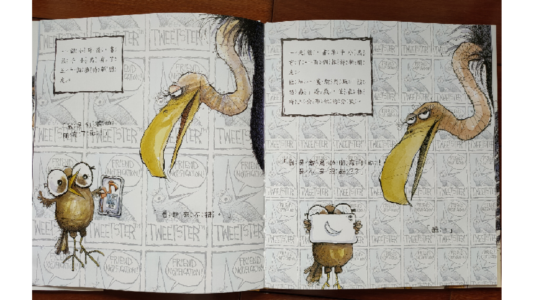 孩子也許擅於操作科技,對社交軟體運用相關熟悉,在網路上能夠輕易結交到朋友,但同樣的網路上也充斥著許多我們看不見的危險。繪本裡小鳥因不了解「網路發布禮節」,以先入為主、自以為開玩笑的方式發布了不當的資訊,導致他和現實生活中的好友禿鷹產生了誤會,友情岌岌可危。