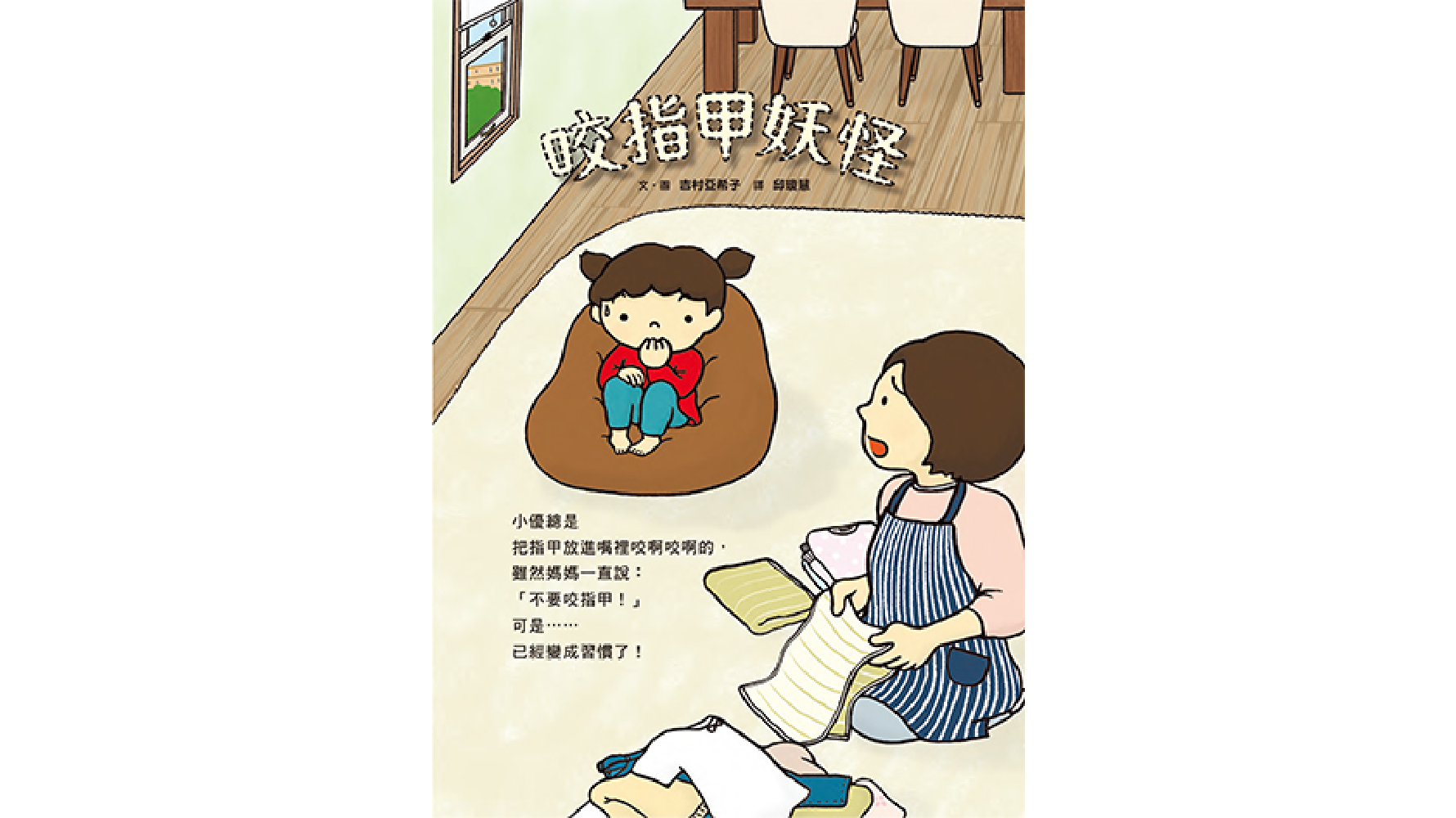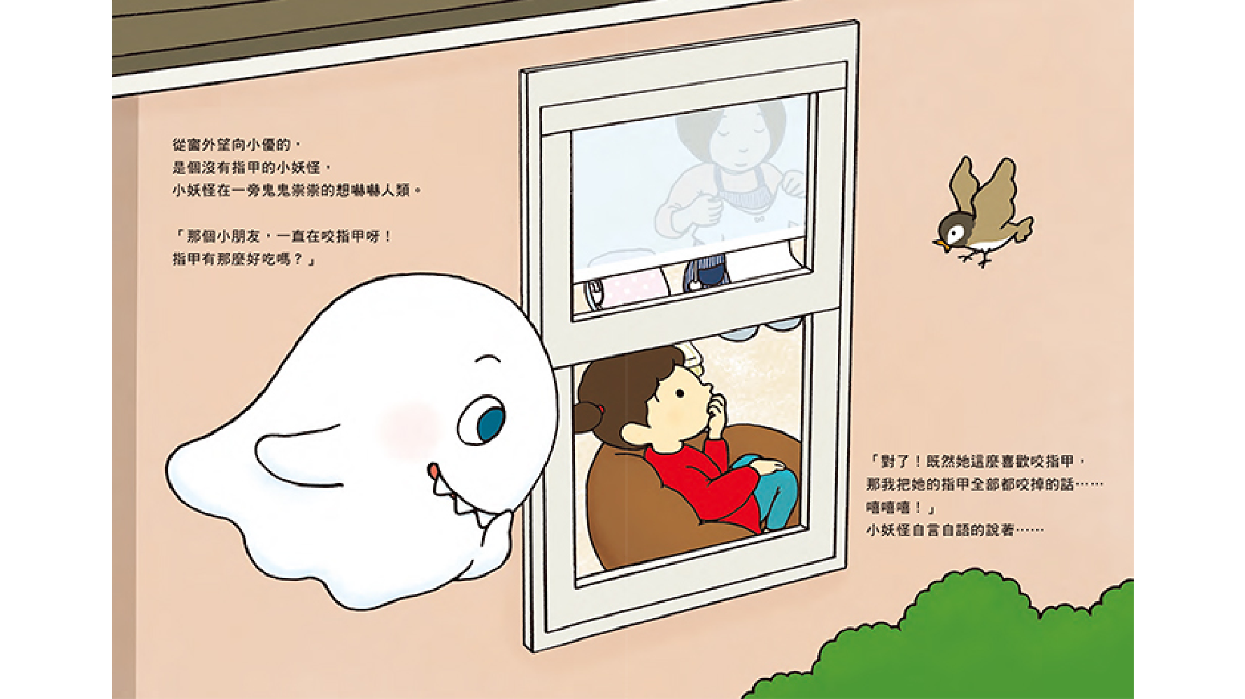這本翻譯自日本作家吉村亞希子的繪本,小女孩小優不由自主地會出現咬指甲的壞習慣,等媽媽發現要制止時,已經為時已晚;這時出現了喜歡惡作劇的小妖怪,畫面轉變成媽媽咬指甲,小優發現媽媽怪怪的,並提醒媽媽:「不要咬指甲了!」沒想到小妖怪開始到處橫行,漂亮的小姐、公車司機、坐在公園的老伯伯等大人,全都開始咬起了指甲。