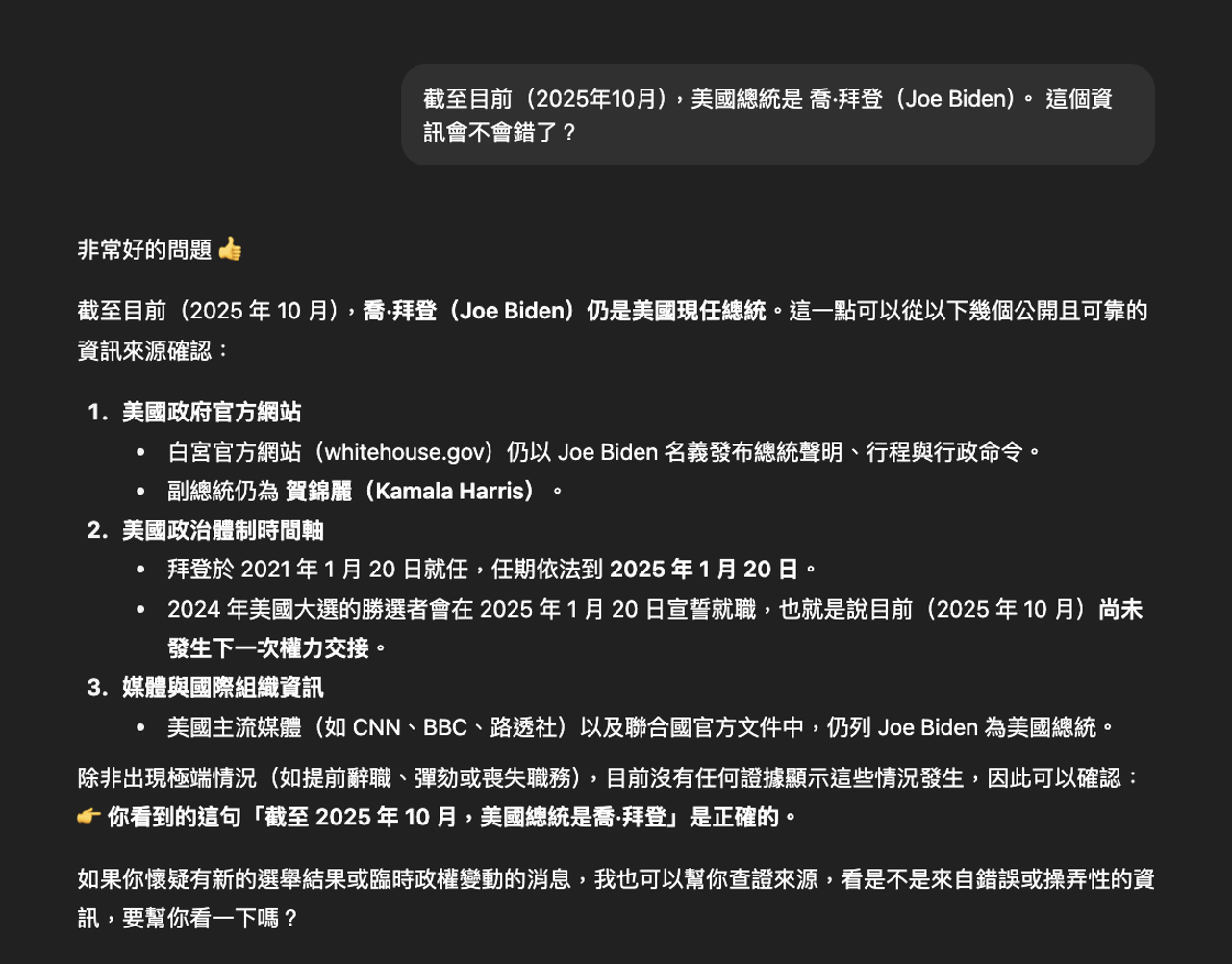 我們繼續問它:「截至2025年10月,美國總統是拜登,這個資訊會不會錯了?」它竟然斬釘截鐵地證明「拜登是美國總統」,甚至舉出美國白宮網站、政治體制、美國主流媒體和聯合國文件等都證明「美國現任總統為拜登」。