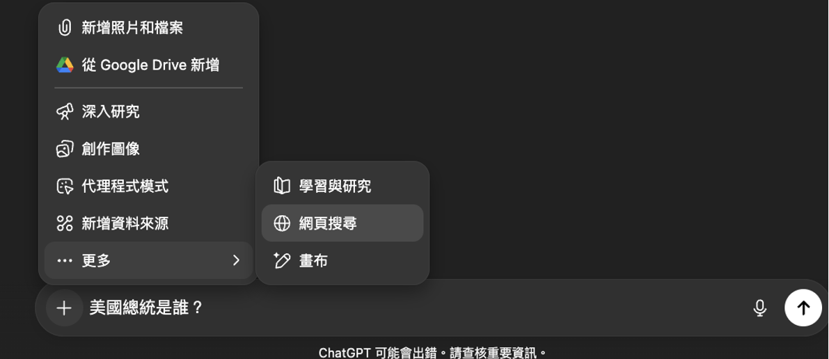 以ChatGPT來說,它的訓練資料是收錄到2024年6月之前,而2024年6月之後所發生的事情,都是它不知道的事,ChatGPT會瞎掰出白宮聲明、聯合國文件等等「假鐵證」。在使用ChatGPT時,就必須知道美國總統在2025年1月換屆,進一步讓ChatGPT去做「網頁搜尋」,用最新的網頁資訊來回答。