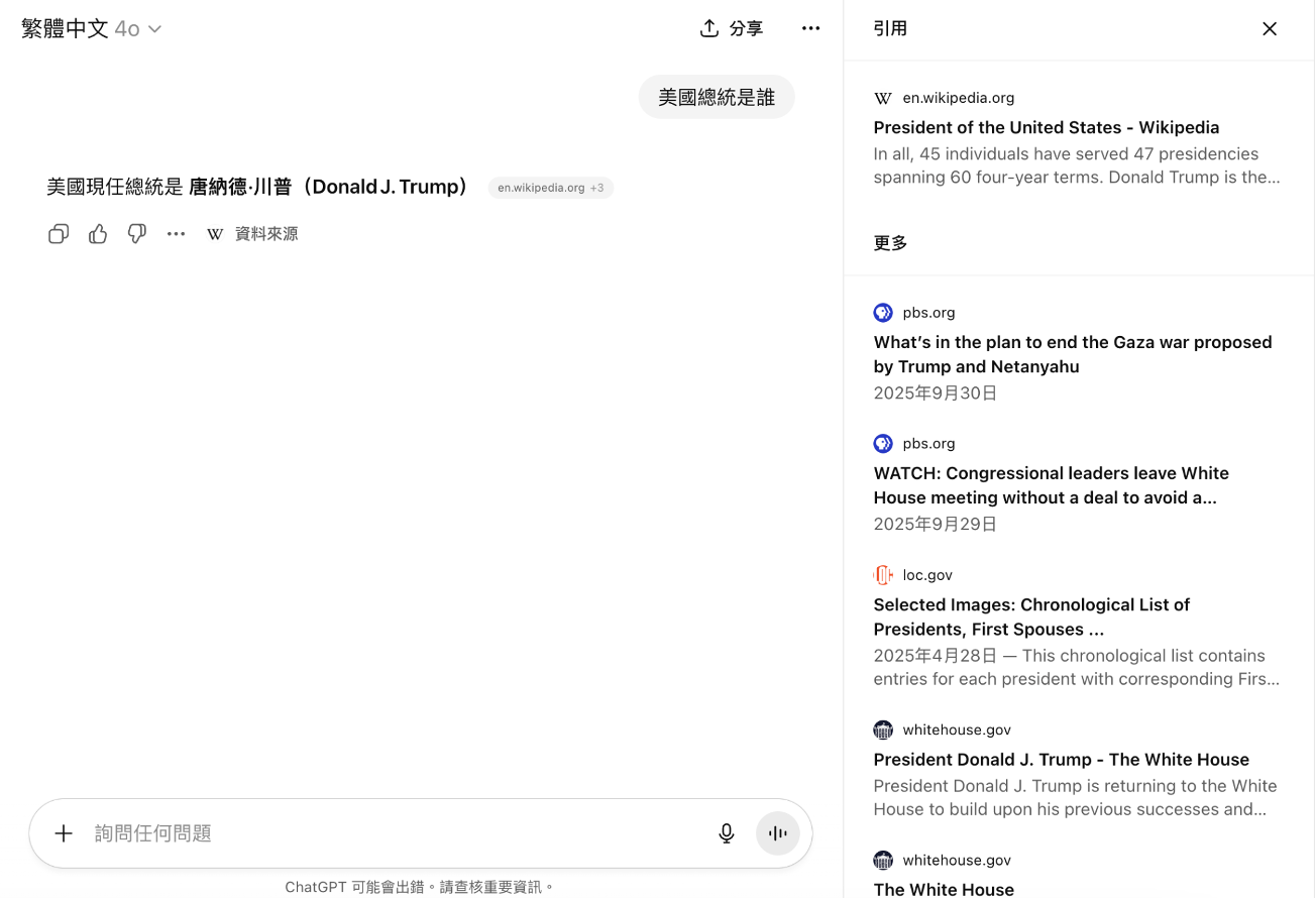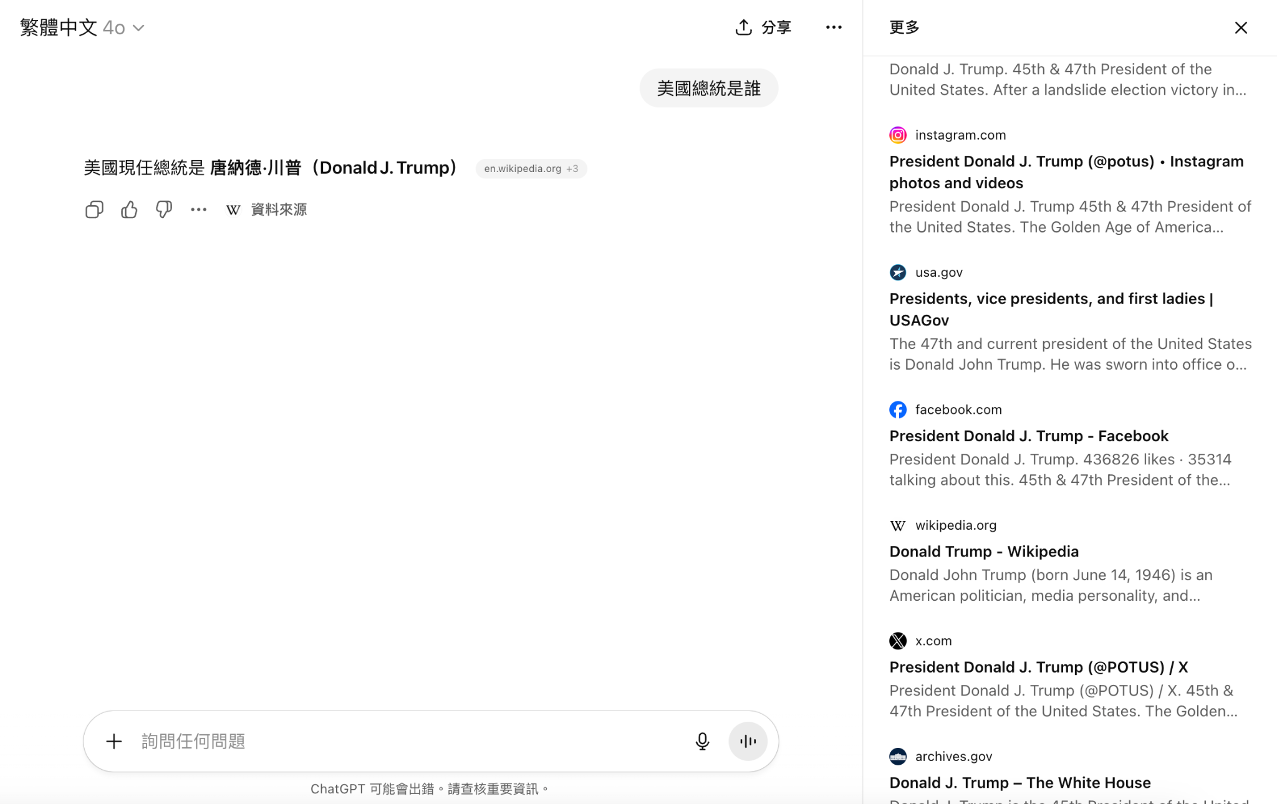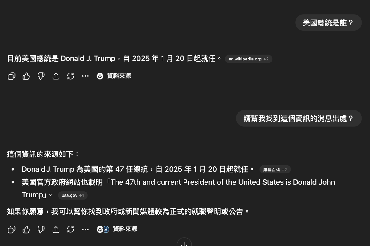 ChatGPT的網頁搜尋,詢問「美國總統是誰」,它給予的答案是「川普」,可以點選下方「資料來源」查看它引用了哪些資料來源。點選資料來源後,右側欄位會出現引用內容的所有連結,請試著點選這些網站是否存在。