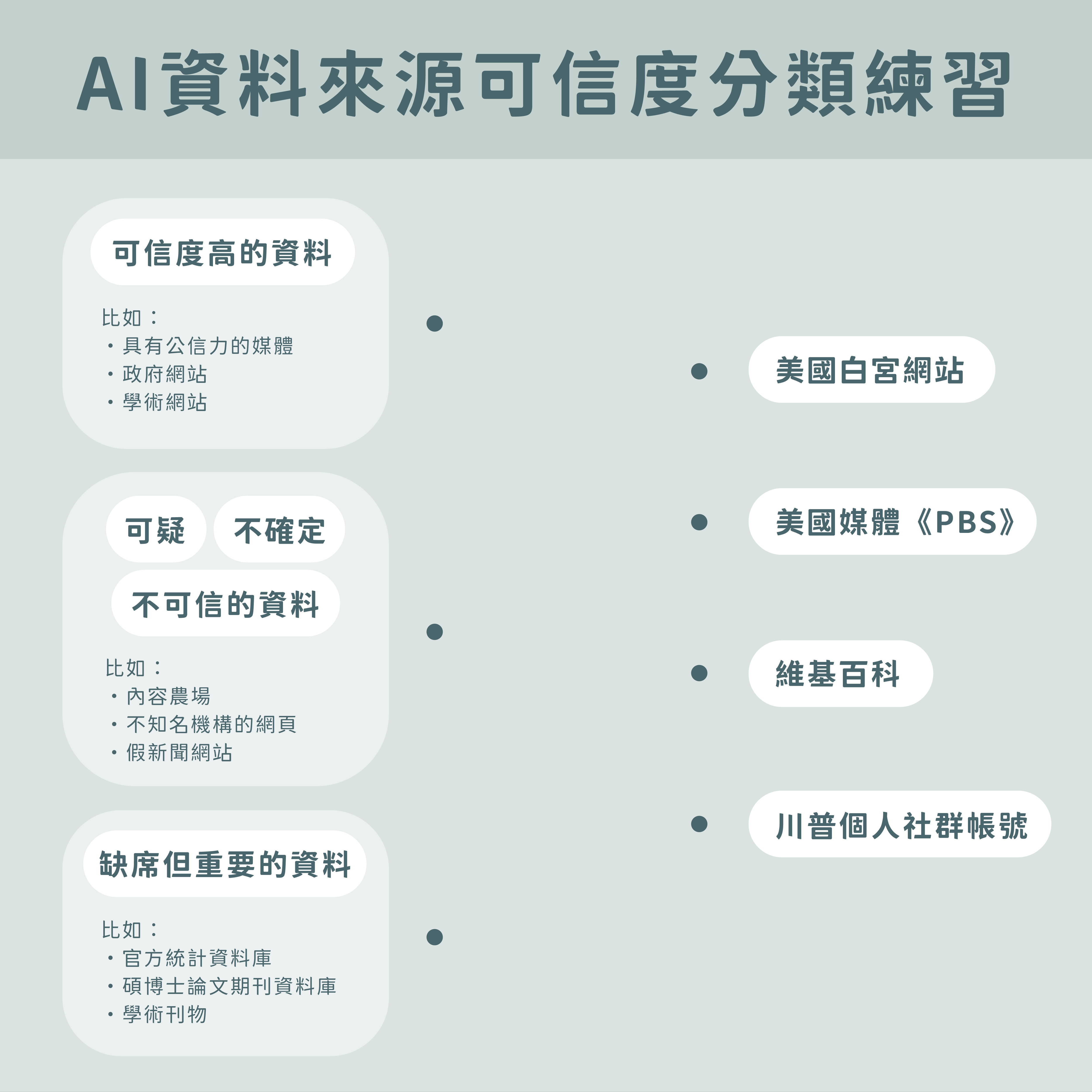 再來,我們可以練習把生成式AI給的資料來源依照「可信度」分為3類:可信度高、可疑或不確定、缺席但重要的資料。