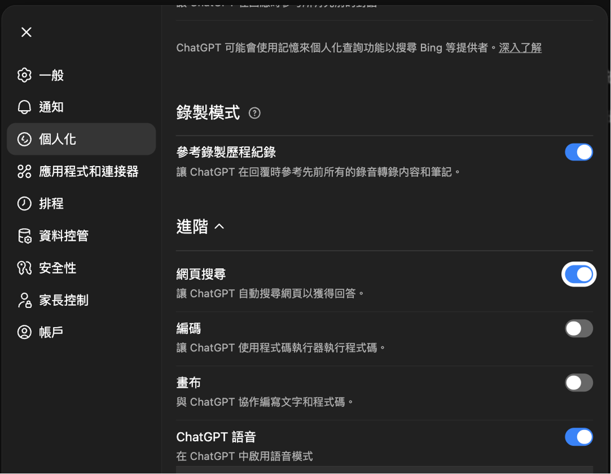 要設定ChatGPT使用「網頁搜尋」功能,有兩種方式做設定,第一種方法,是點擊左下角帳號的「個人化」,打開「進階」,去確認有打開「網頁搜尋」功能;第二種方法,是在提問的對話框,選取「網頁搜尋」。