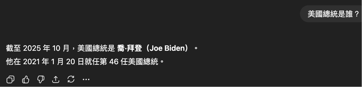 我們是在2025年10月22日進行測試,ChatGPT答錯了,它說是喬.拜登(Joe Biden)。實際上,2025年1月20日那一天,唐納.川普(Donald Trump)已就任美國第47任總統。