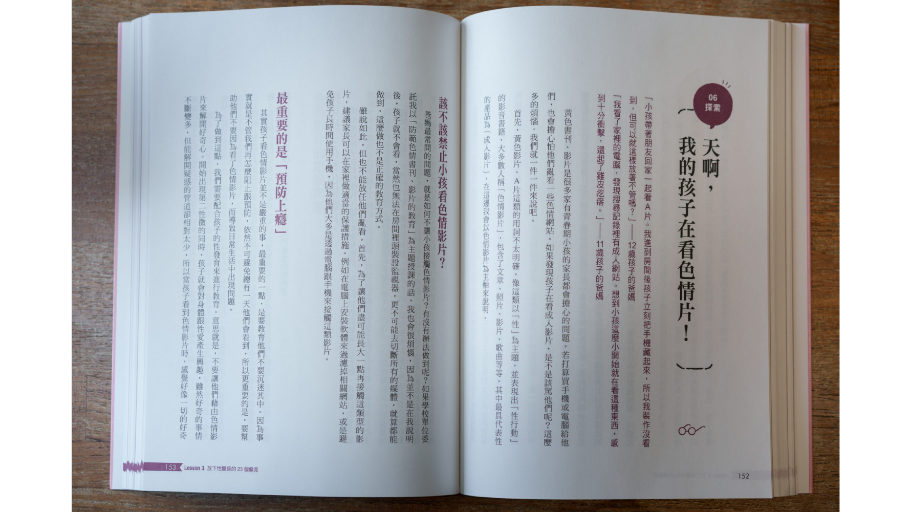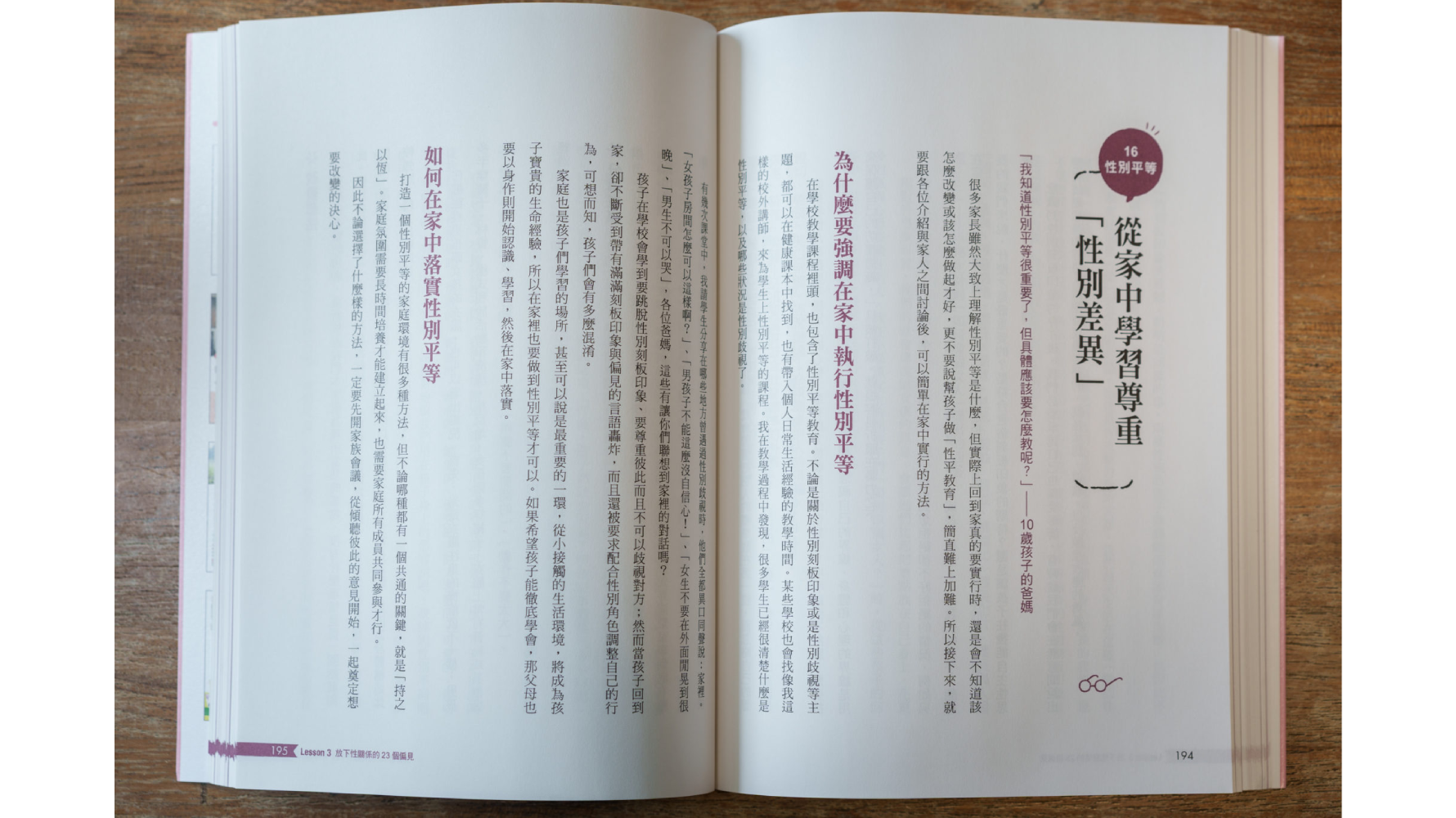 本書開宗明義強調「性很自然」,也不是專屬於成人的事,當孩子開始對性好奇,就是進行性教育的好時機。不用強調「爸爸教兒子、媽媽教女兒」的刻板印象,性教育是全家一起的共同教育,讓孩子遇到性方面的疑問時,知道身邊有人可以討論;當孩子不想談的時候,成人也要給予尊重。