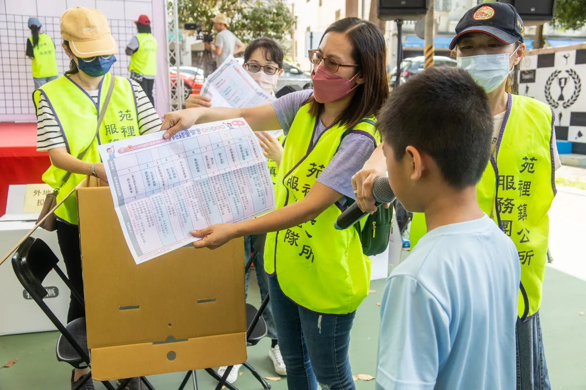 9月14日苑裡鎮立體育場台上的活動背板寫著大大的「苑裡童樂會,民主來札根」。全鎮所有從幼稚園大班到國中一年級的學生,都有投票權,在比照總統大選規格的票匭,投下慎重一票。花了6個月時間針對「10萬元的兒童節預算應該怎麼花?」參與提案的學生們,緊盯著台上的計票表。