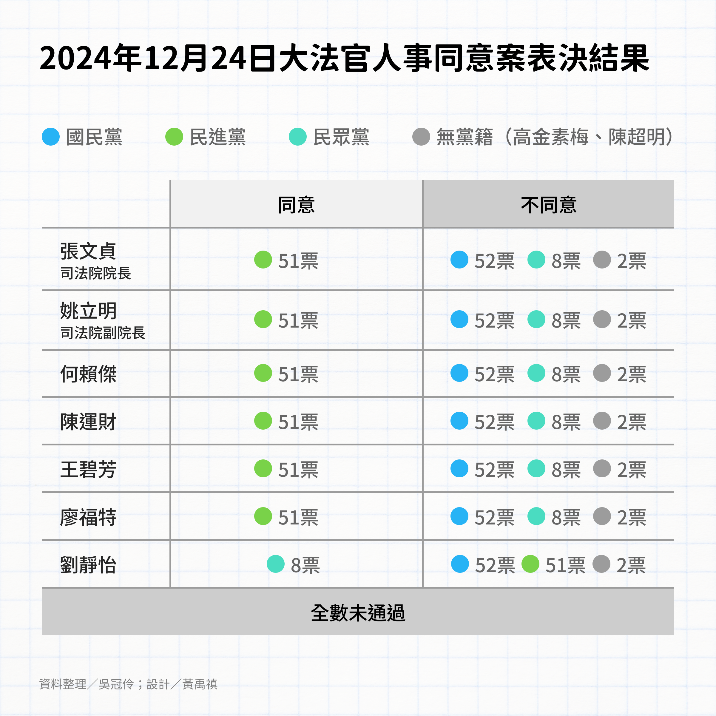 回顧本次大法官選任過程,在原本7位大法官任期於去年10月底屆滿後,立法院仍未審議新任大法官人事同意案,直到去年12月才開始召開公聽會,並陸續邀請被提名人赴院會接受立委答詢。最後在2024年12月24日舉行投票表決,沒有任何一位被提名人取得過半數同意票。