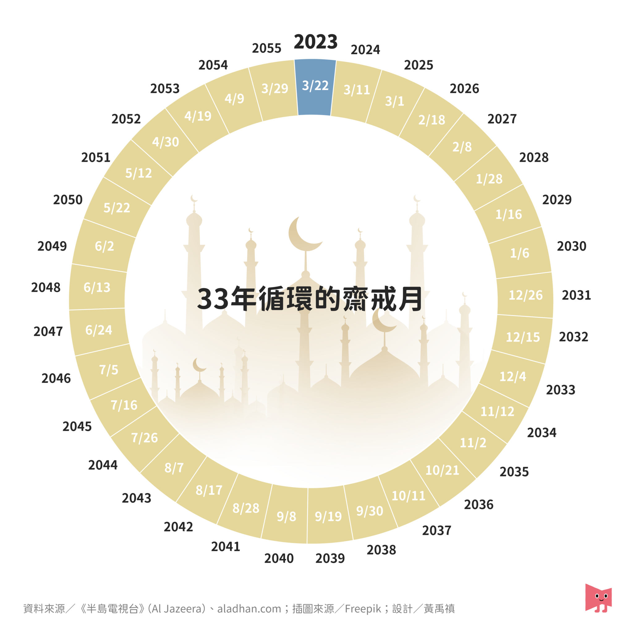 這也意味著每隔33年西曆時間,齋戒月時間就會重新循環,以2023年3月下旬開始的齋戒月,約在2056年又會回到同一個時間點。 此外,由於各地日照時間長短不同,穆斯林群體齋戒時間從10小時到21小時不等。像是生活在極南地區如智利、紐西蘭等國的穆斯林,平均每日齋戒時長約為11小時;生活在極北地區如挪威、冰島等國的穆斯林,平均每日齋戒時長至少為18小時。