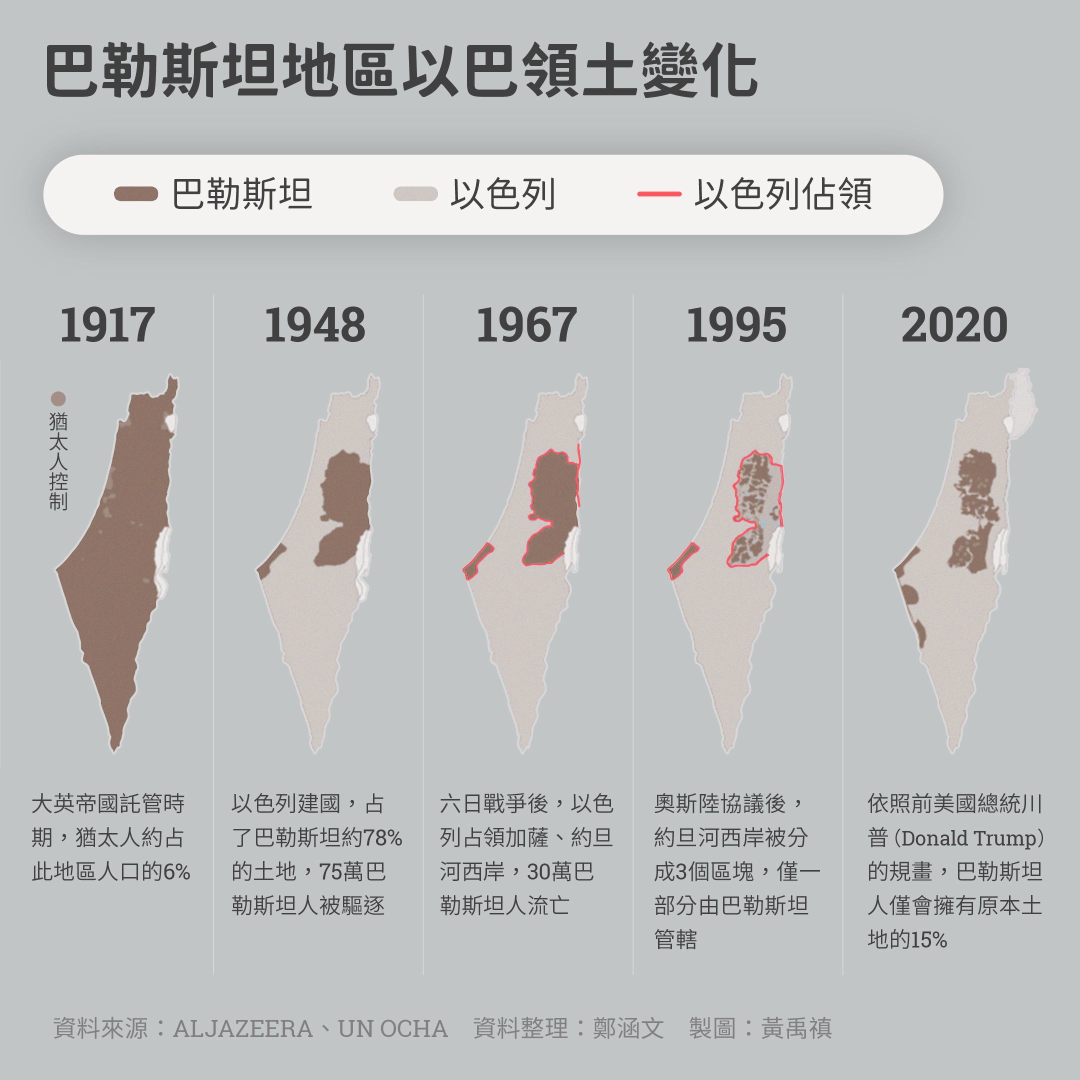 在以色列建國之後,巴勒斯坦國土愈來愈破碎且被高度控制,就變成了今年(2023)發動攻擊的激進組織哈瑪斯崛起的重要原因。