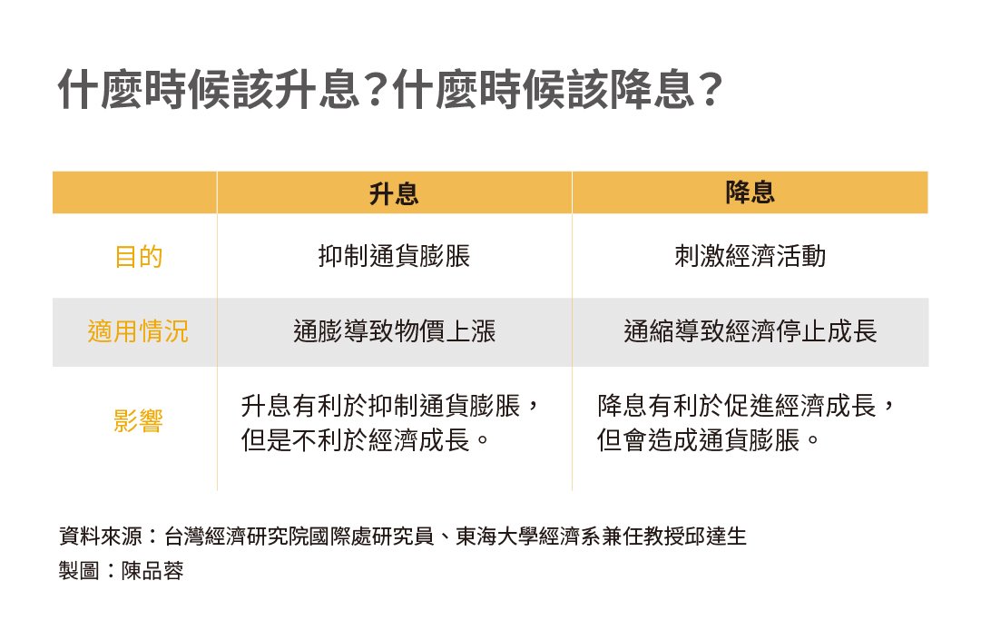 簡單來說,利率的調降很像水庫的閘門──如果中央銀行調降利率,就像把閘門打開,讓更多的貨幣流入市場、刺激經濟活動,通常是預防通貨緊縮的手段;如果調升利率,就像把閘門關上,阻止貨幣大量流入市場,可以抑制經濟活動,這也是許多政府抑制通貨膨脹的手段。