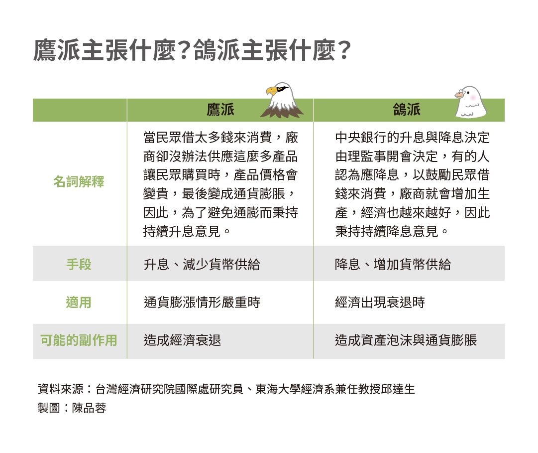 由此可見,如果在通縮時期要刺激經濟,就需要大量的貨幣流入市場;相反的,在通膨時,中央銀行則可以靠調升利率來抑制上揚的物價。如果政府發現目前發生的是通膨過度而決定升息,因為政府採取較為積極強硬的手段介入市場,這樣的策略就會稱為「鷹派」;如果政府認為目前發生的通膨有助於經濟的發展,決定暫時靜觀其變,先不升息,這樣的策略就會被稱為「鴿派」。
