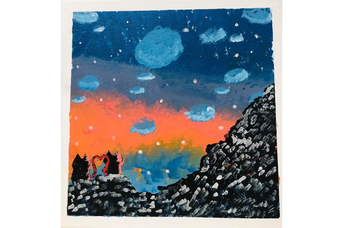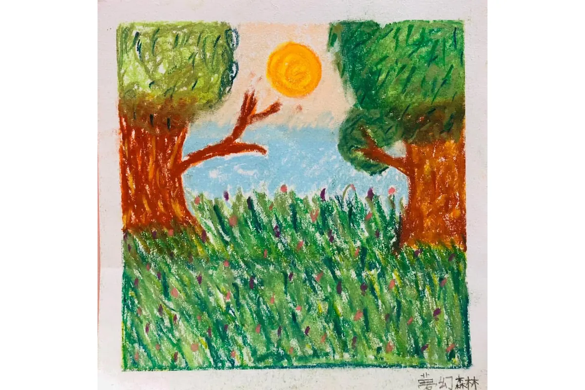 因為我從小喜歡畫畫,當我心情不好時,就會畫畫,其中一幅畫著大大的太陽,那是我在害怕上學時畫的,我想像著太陽升起時,心情會變得很好。我現在累積很多畫畫作品,媽媽也鼓勵我參加市集擺攤,我把創作印在布包、杯墊、胸針上,我很喜歡跟每一個人聊作品,尤其當有人喜歡我的作品時,會很有成就感、很開心。