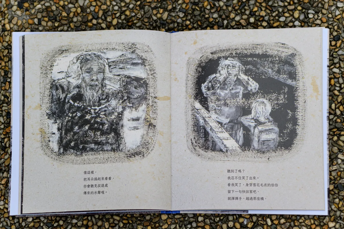繪本畫面出現了一位長者,他對小男孩說:「把耳朵摀起來看看,你會聽見從遠處傳來的水聲喔。」