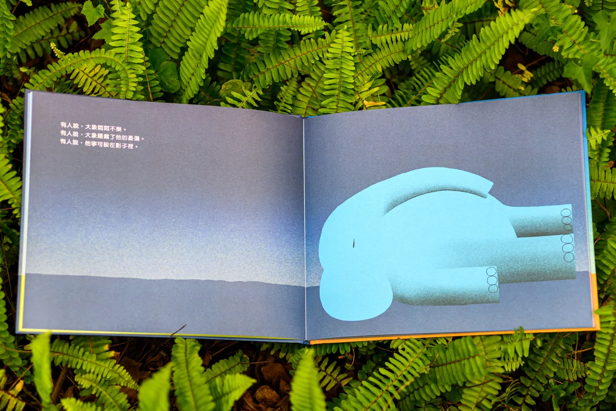 大象在書頁上,像一隻被關在箱子及自己思緒裡的動物,巨大體型無所遁形,困在窘境中。藍色大象在影子裡,一下躺著,一下坐起來,但始終不願意離開陰影。