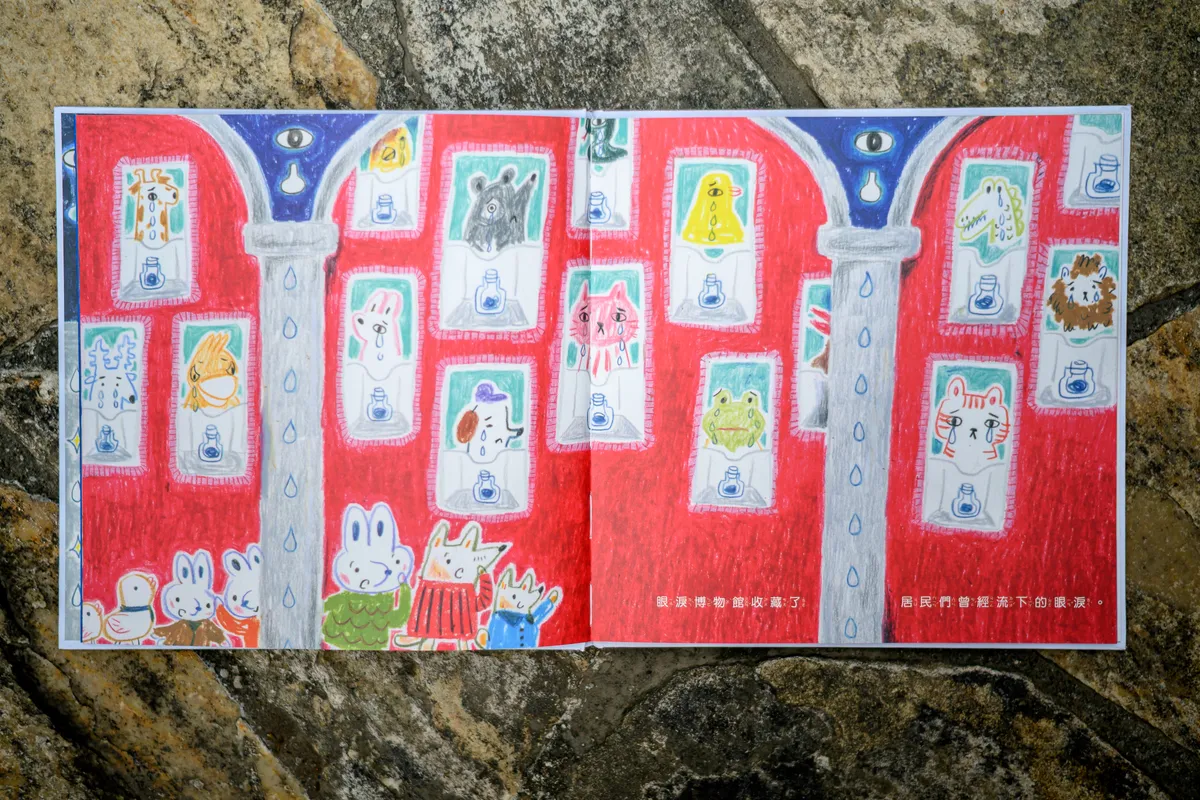 「我在做這本書的時候,流的眼淚應該可以再開一座眼淚博物館了吧(笑)?一開始的幾頁就陷入了找不到方向的困境,甚至懷疑自己可能沒有創作的天分,是不是該放棄當繪本作家的夢想?還好後來有好多位創作者的陪伴,我順利地畫完了!就像一開始做這個故事的動機一樣,我認為每次流淚都是即將成長的生長痛。眼淚,不是膽小或不勇敢的象徵。它代表著每個成長的瞬間,它是我們勇敢跨出舒適圈、重新站起來的美麗結晶。因此,它值得被當成珍貴的寶物一樣,展示在博物館中!下次流淚的時候,不妨好好記錄下來,讓我們一起成為驕傲的愛哭鬼吧!」