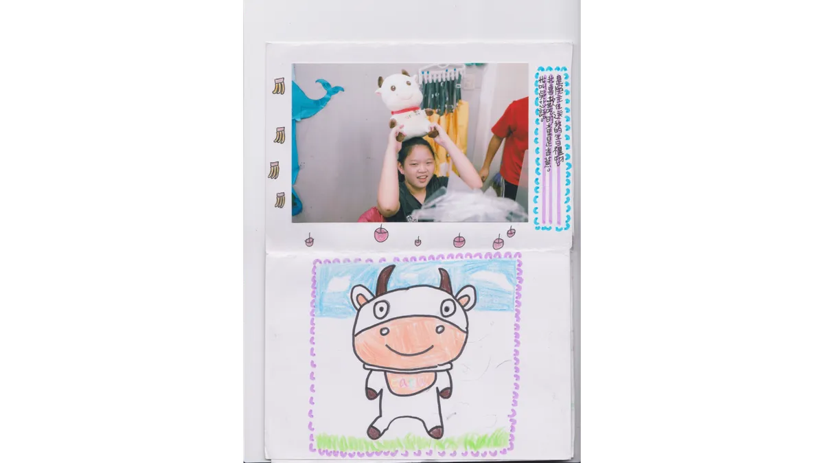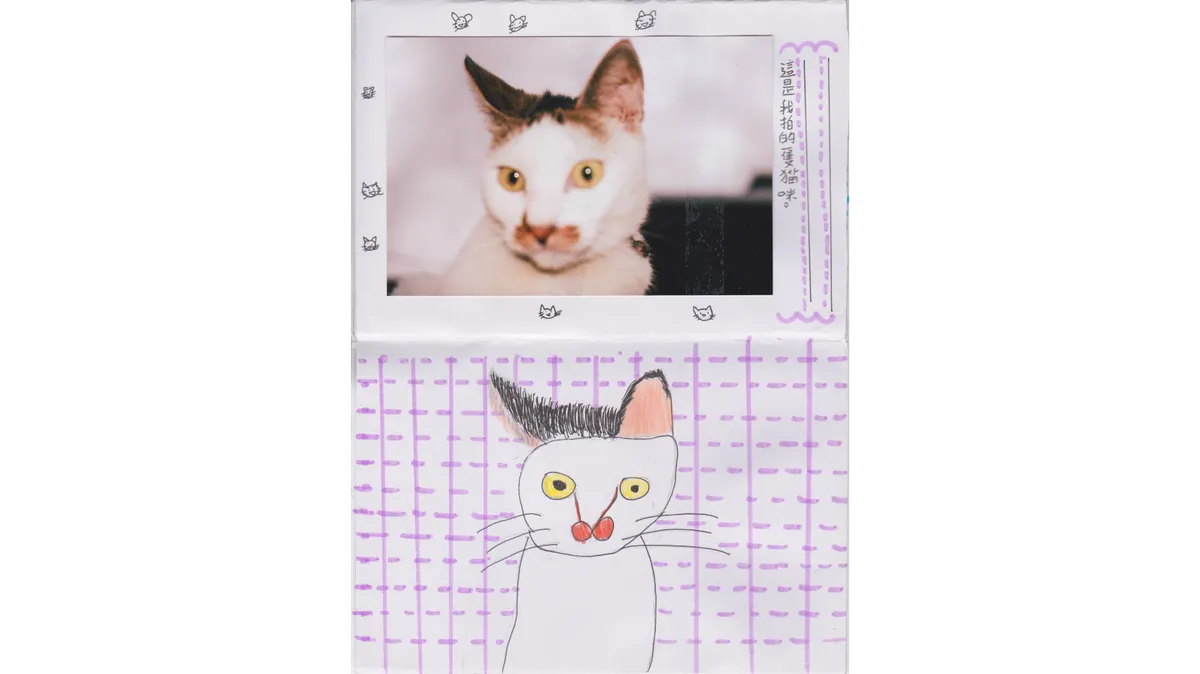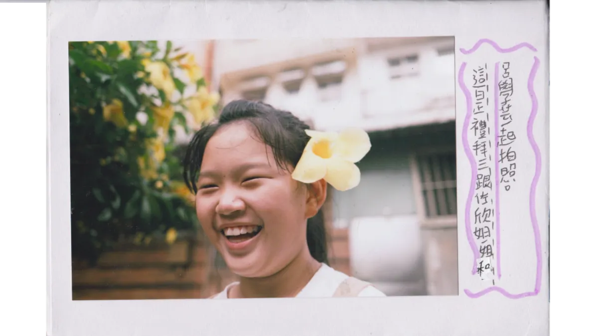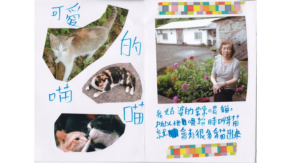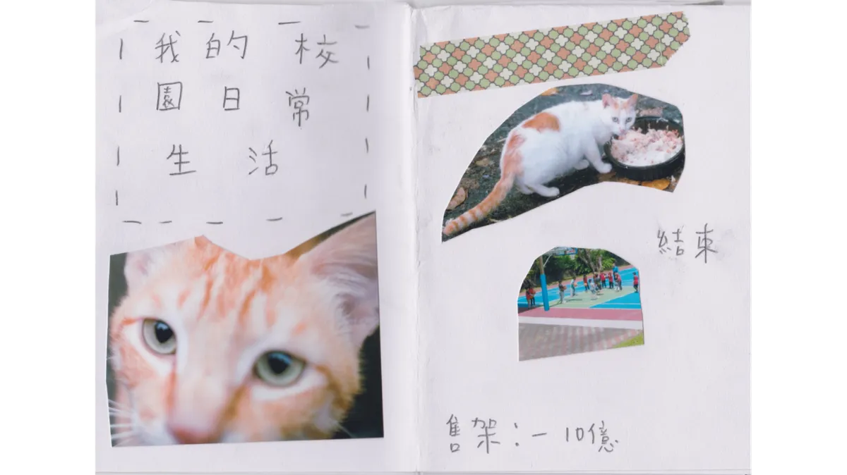 瀠霈對組織故事很有想法,只要手邊有素材,她就能即興地在相片書中自成一個宇宙。她的性格獨立、早熟,時常扮演照顧同學的角色。她的鏡頭對準了校園中的生活、放學後帶同學練習腳踏車的時刻、鄰居家受傷的狗,以及每個大里小孩都熱切注視的貓咪。刻著大里國小原校地址的紀念鑰匙圈放在她的課桌上,她期待回去後能繼續記錄校園生活。