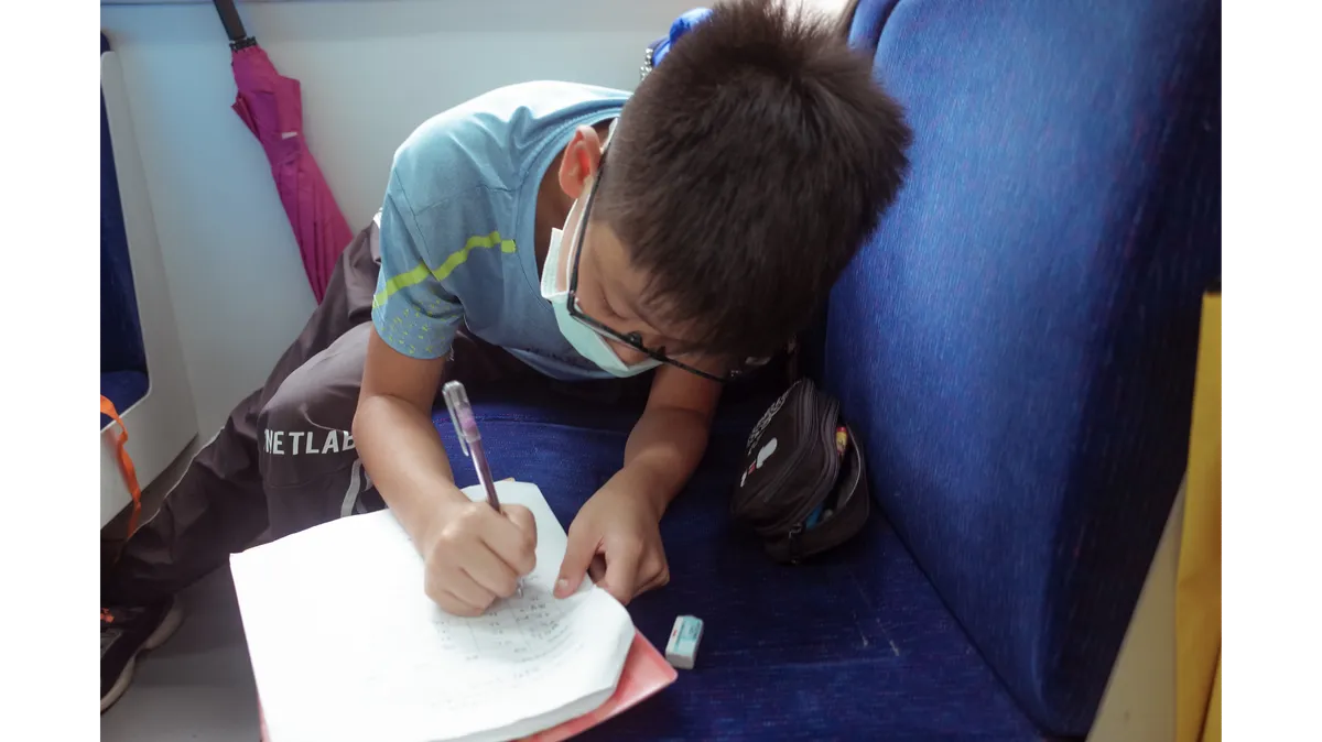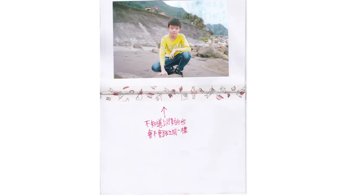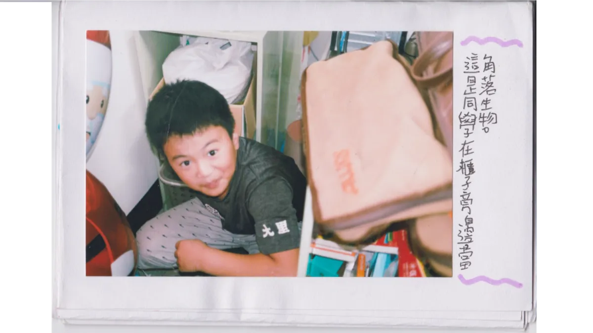 昱銓的桌子上壓著幾張大里-大溪的車票,那是他獨立搭火車來學校參加考試的紀念。同樣住在大里火車站附近,他跟藝傑是表兄弟,是班上最喜歡小動物的學生。在外頭練習拍照時,他常常忘我地觀察海岸的貝殼、招潮蟹,手上還會不時出現金龜子。