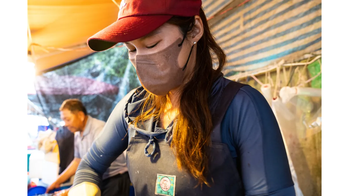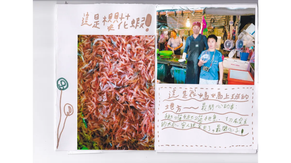 「媽媽跟我差20歲,她很高有170公分,她總說生我才變胖。大溪漁港是我媽媽上班的地方,她的工作是跟客人介紹魚,還有把魚切成完美的大小。不過,她是跟爸爸結婚之後,才來漁港,一開始不認識魚,也不會殺魚。她最開心的事是客人說『全包了!』」