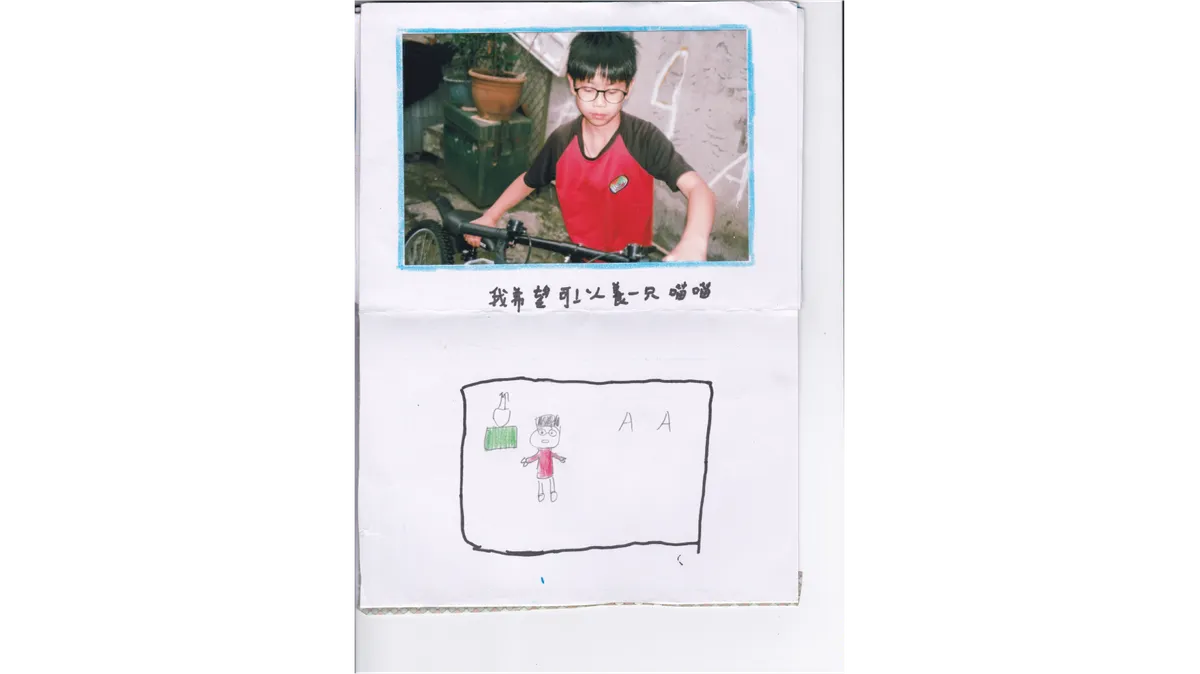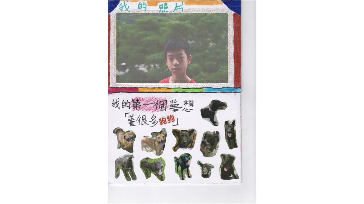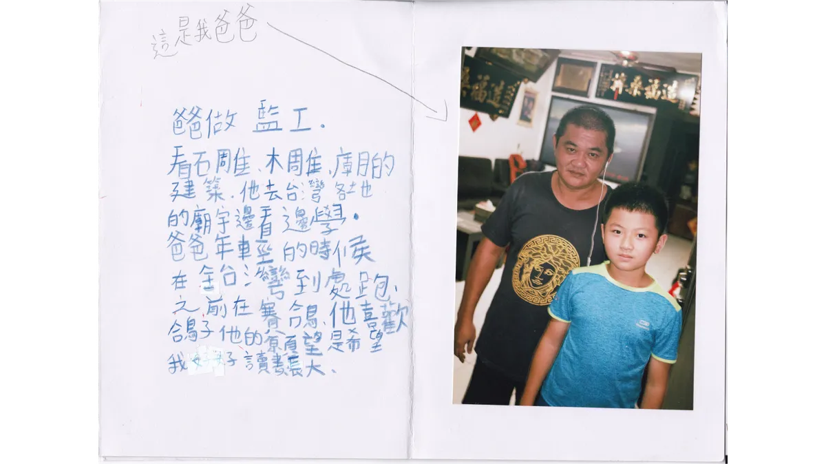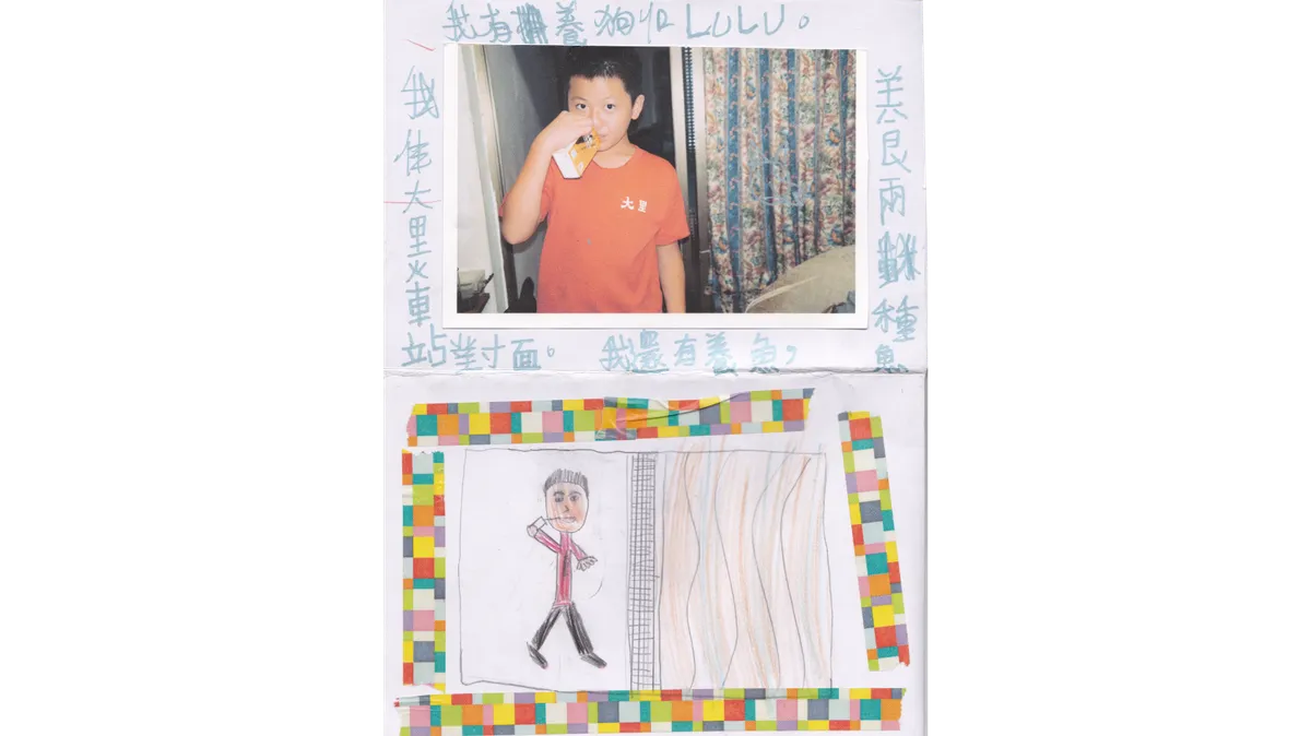 「我住在大里火車站對面,我家有養狗叫Lulu,還有養魚。我的爸爸是建築業的監工,會看石雕、木雕、廟的建築。他以前去台灣各地的廟宇邊看邊學。爸爸年輕的時候在全台灣到處跑。他喜歡大里很單純。他之前在賽鴿。他的願望是希望我好好讀書、長大。」