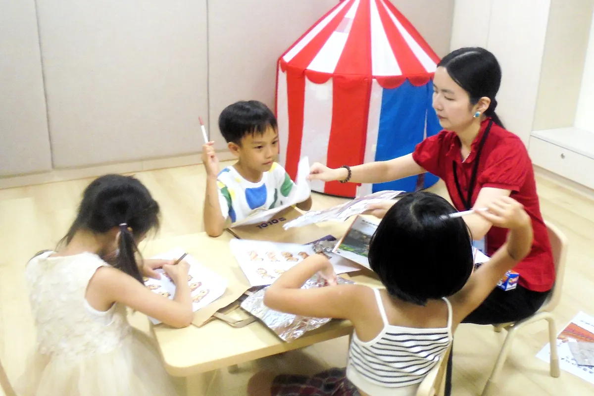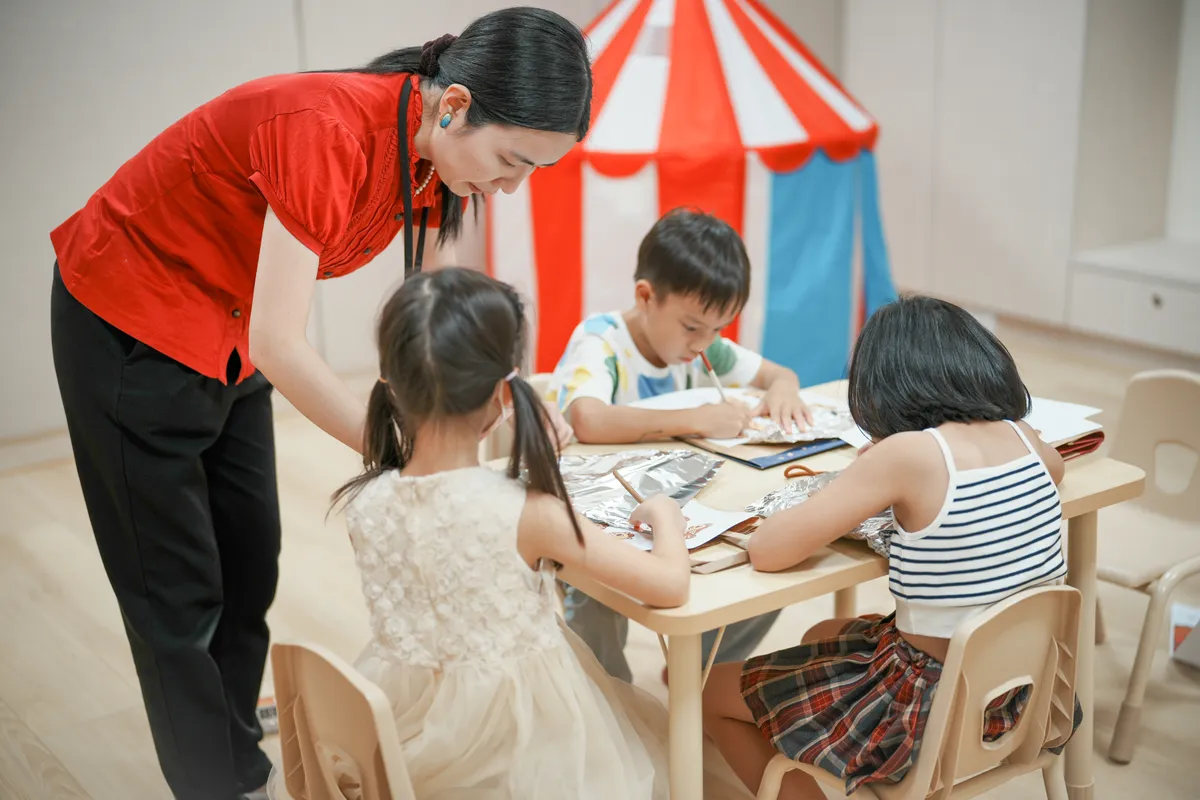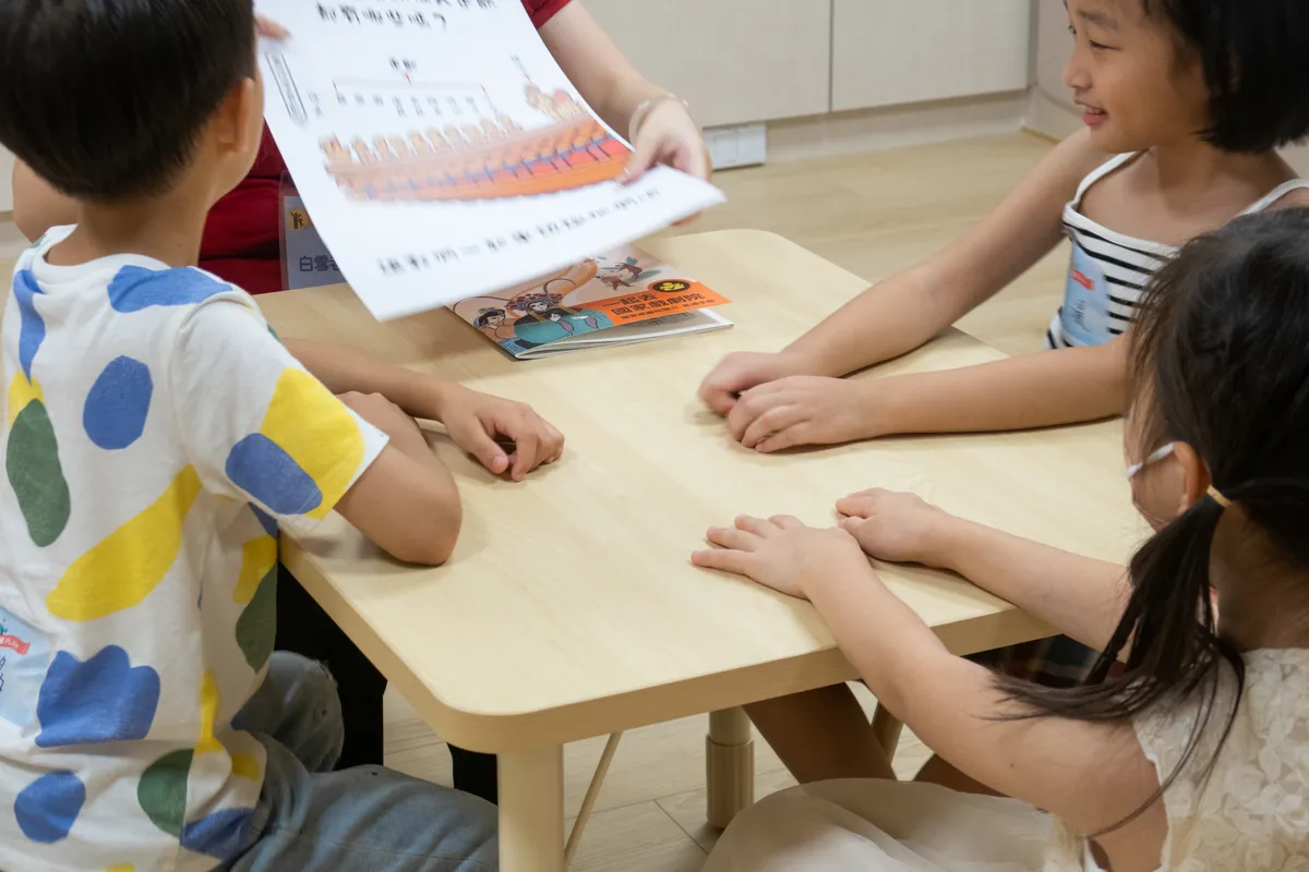 當「藝童PLAY」裡的孩子開始吵鬧時,帶課白雪老師會把「管秩序」的方式融入在遊戲裡,「我等一下數到5,我轉頭的時候要看到你們的人坐在椅子上,你的手要放在桌子上,你的腳要踏在地板上。」孩子跟著白雪老師一起做的時候,他們會覺得這是一個有趣的遊戲。劉子猷的照片就對準了孩子們「伸直雙手平放在桌上」那一瞬間,那是孩子和老師在遊戲狀態中互動產生的結果。