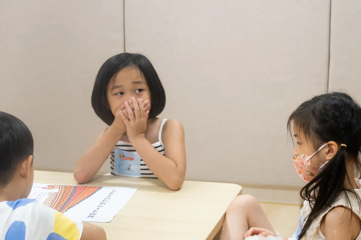 「一位小女生用雙手摀著嘴巴,看著外面,彷彿外面發生了什麼。我覺得這個女孩和旁邊其他人的神情有所反差,因此我就把這瞬間記錄下來了。」小記者楊晴瑜體會到,決定性的瞬間就是按下快門的那一刻,按下快門就等於拍下一張能決定那一瞬間的畫面和內容,就像寫了一個小故事。