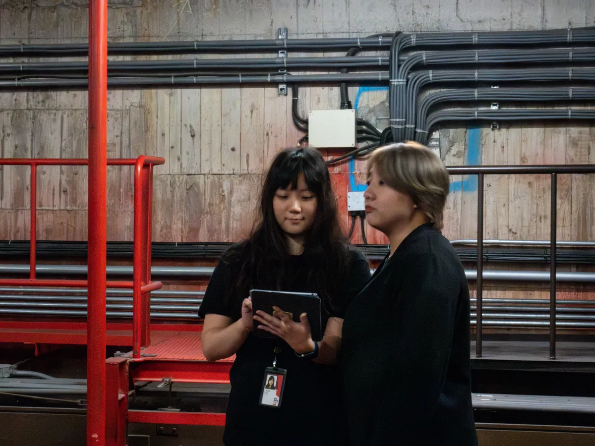 此回接受小記者專訪的是兩廳院技術管理組胡翊潔與統籌管理組陳奕臻,兩人從事劇場工作近11年,分別在兩廳院服務了6年和5年,主要負責演出背後的技術支援,協助落實創作團隊對於舞台的想像,讓劇本中的劇情、視覺、聽覺等各種感官效果,在舞台上真實呈現,創造出各式各樣的氛圍效果。