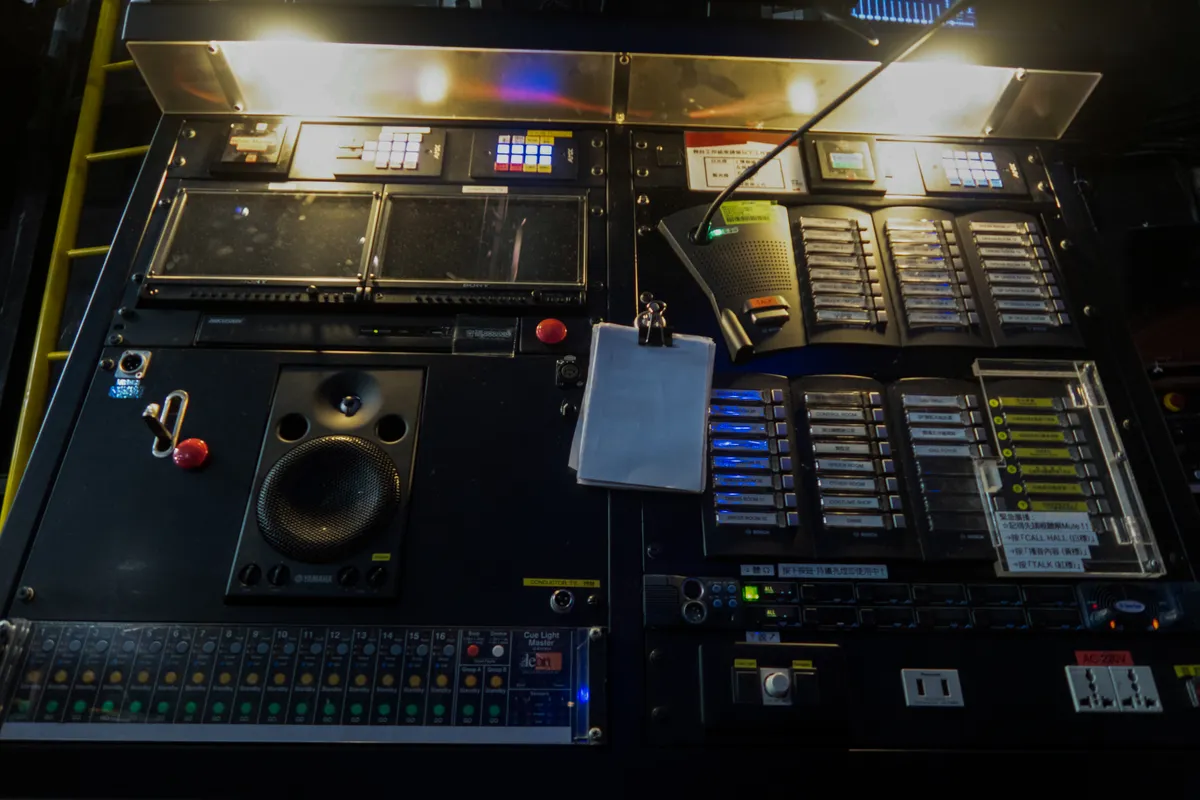 舞台的側邊藏著一個機台,上面有著密密麻麻的按鈕加上監看螢幕,還貼著一張張筆記紙條,這是「舞台監督桌」,小小的機台可以控制舞台上各種設備及機關。舞台監督從表演開始前到表演結束後,這個角色都躲在側台的布幕背後,管理並控制舞台上的種種技術流程,看似神祕卻至關重要。