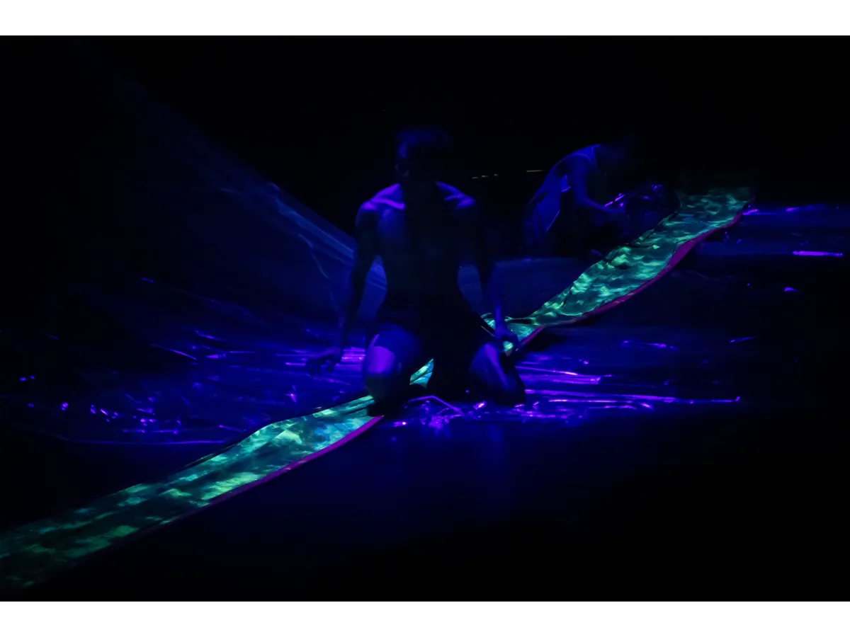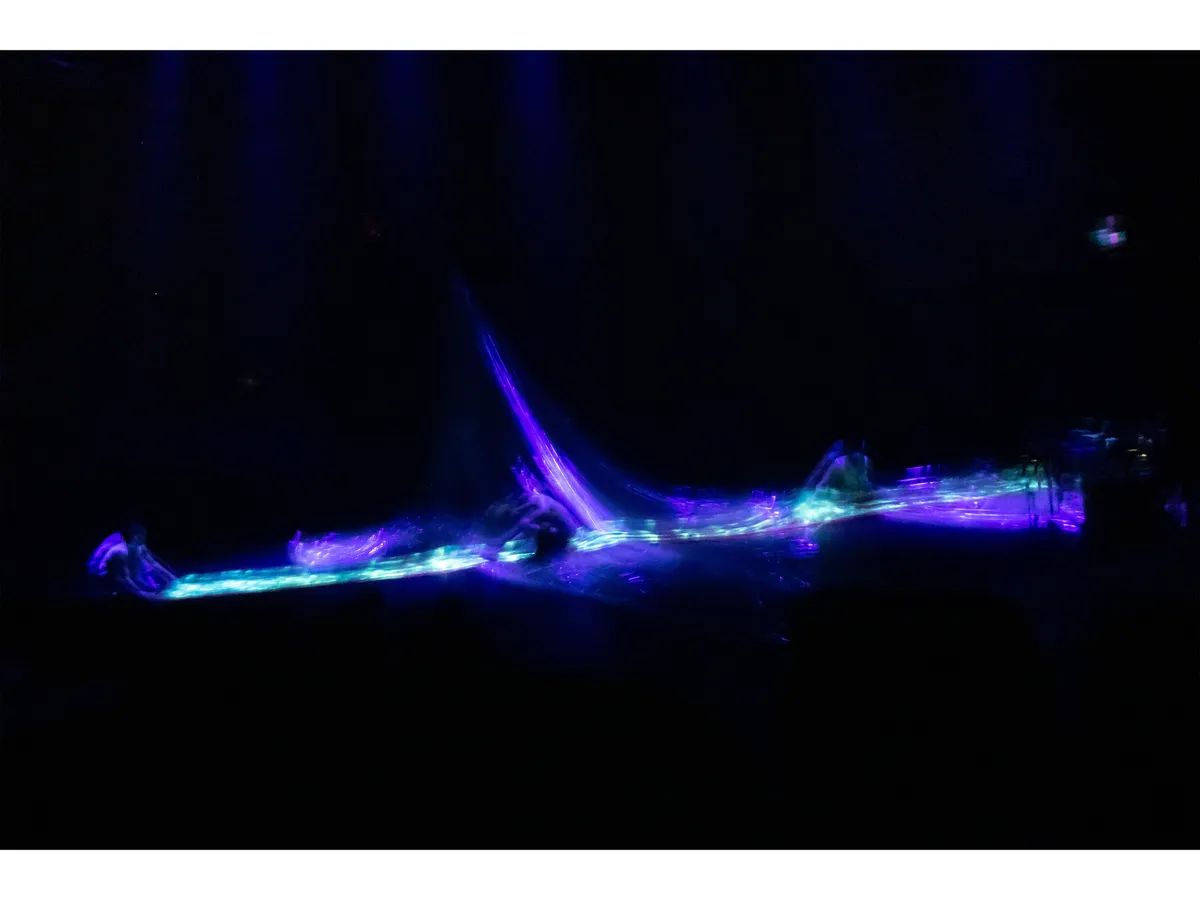 在接近舞作的尾聲,有一段燈光全暗的時刻,只留下發光的布幔,和3位舞者在這之中游動。第一天課堂中所提到,攝影可以藉由「光的顏色」營造特殊氛圍,小記者對於這段表演設計最有感覺,林雨萱比喻:「綠色發光的布像河流,他們在河流裡舞動。」賴宜萱則感覺到「有些紫色或綠色的光線很恐怖,有些光線很痛苦」。在小記者的影像中,「水」的意象非常強烈,吊掛的布幔像是流瀉的水,平躺的布幔是河流,也是海面。甚至,楊禮璐很敏銳地聯想到馬祖的藍眼淚。
