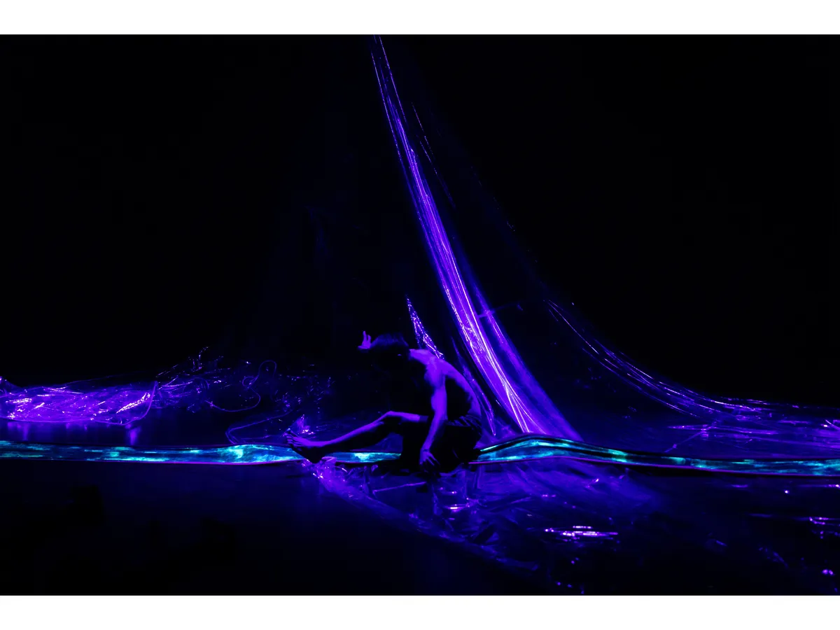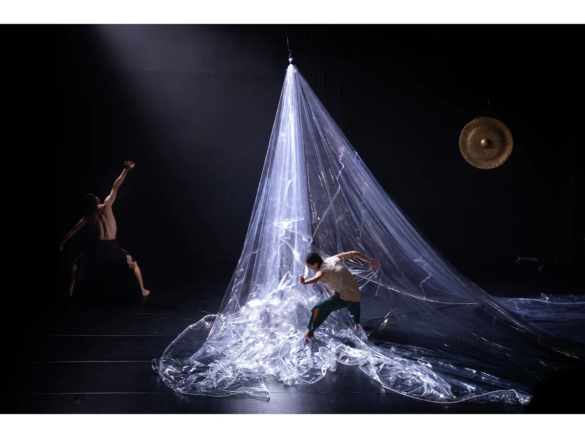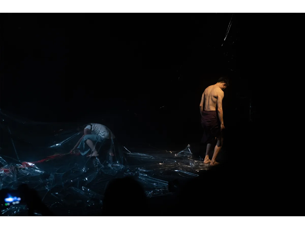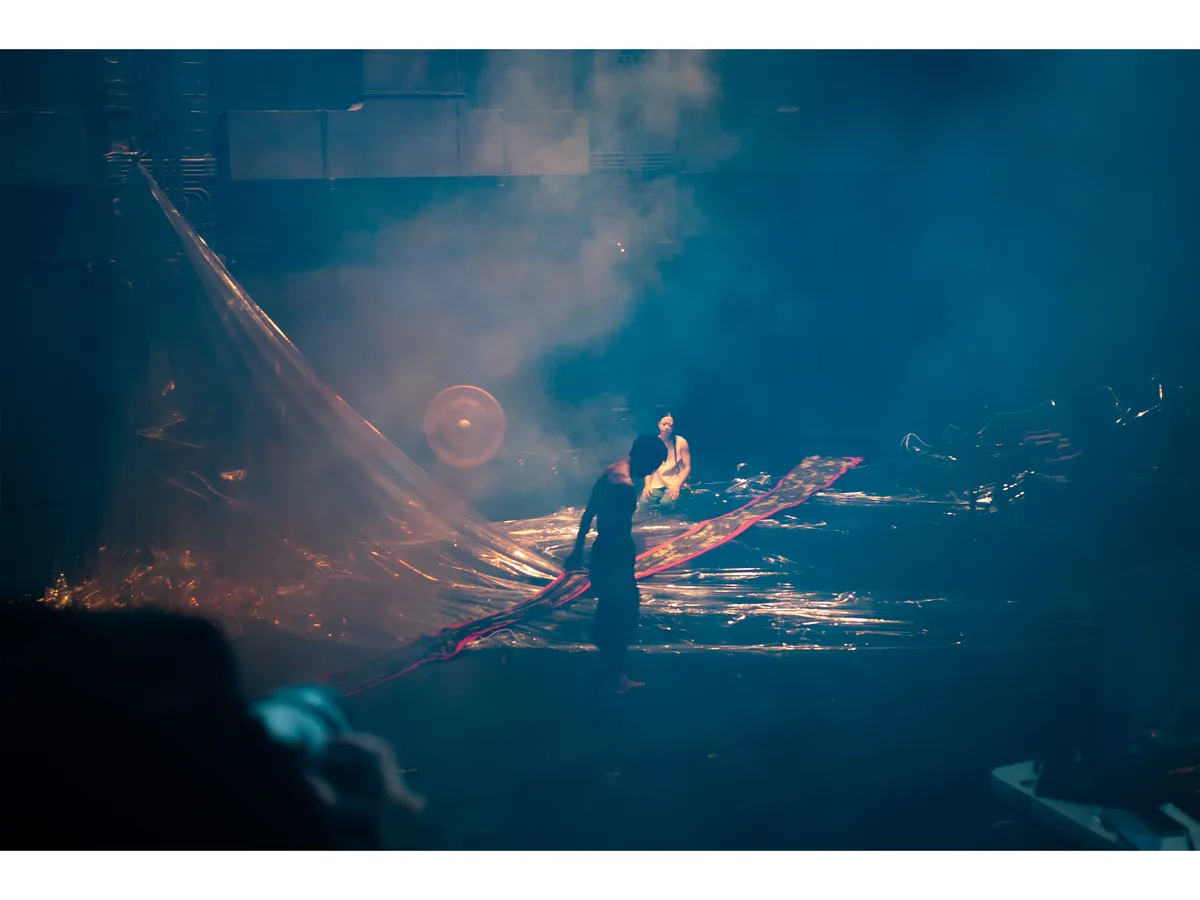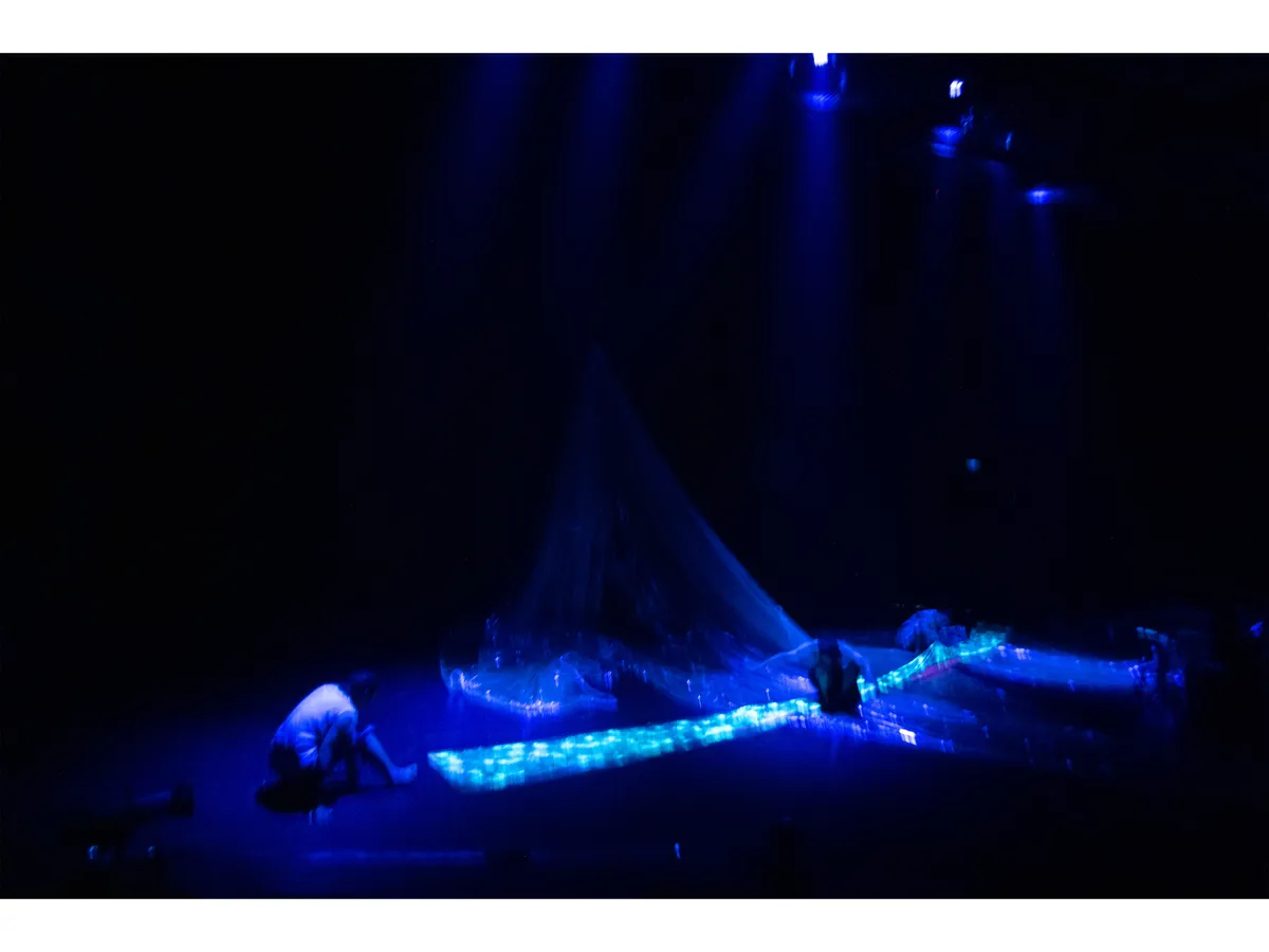 兩廳院在2024年的秋天藝術節邀請壞鞋子舞蹈劇場演出《島嶼恍惚》。本舞作的起點源自於東港迎王祭典中的「震隆宮大鼓陣」,這是由印尼漁工組成的陣頭,在遶境隊伍行進間,這群漁工坐在發財車上,以北管樂器敲擊甘美朗(Gamelan)式的樂音,車身隨節奏大力搖晃,在宮廟前與乩身的「恍惚」疊合在一起,而這樣的「恍惚」也連結到了編舞家林宜瑾心中所思考的「海洋」──因為邊界的改變、國家身分轉換而被迫離開家園的人,他們就像是在海上流亡的靈魂,看不見岸的彼端。《島嶼恍惚》是關於召喚海靈、提醒遺忘,渴望重新連結人類與自然的作品。