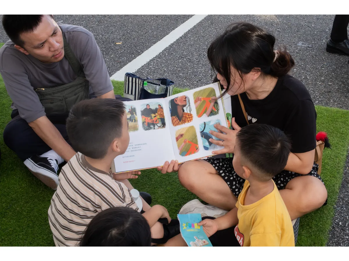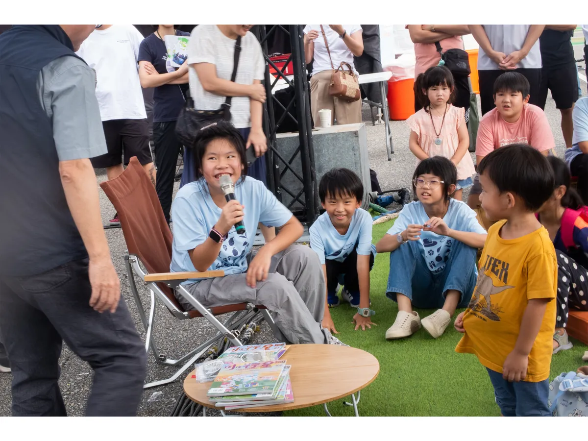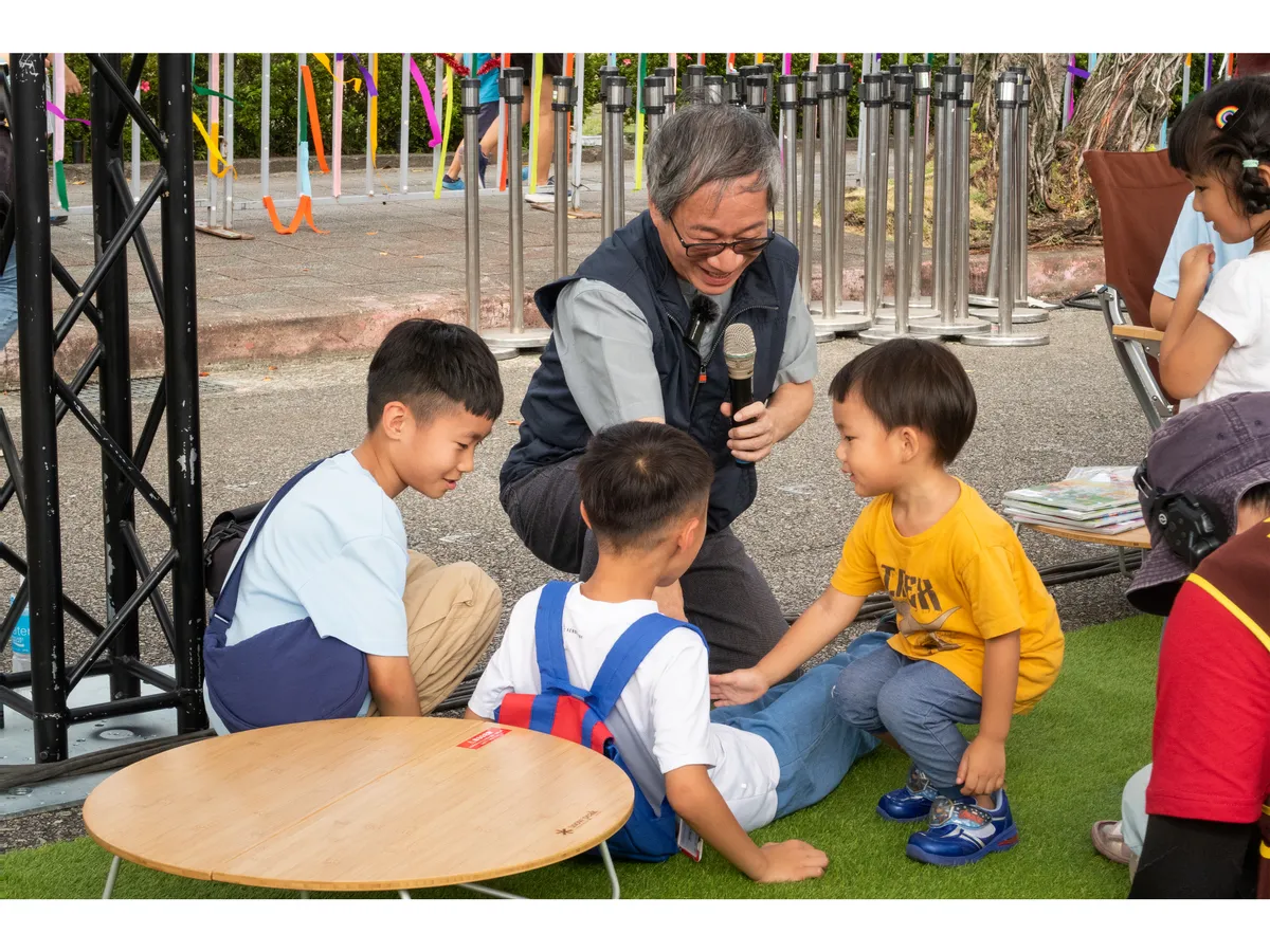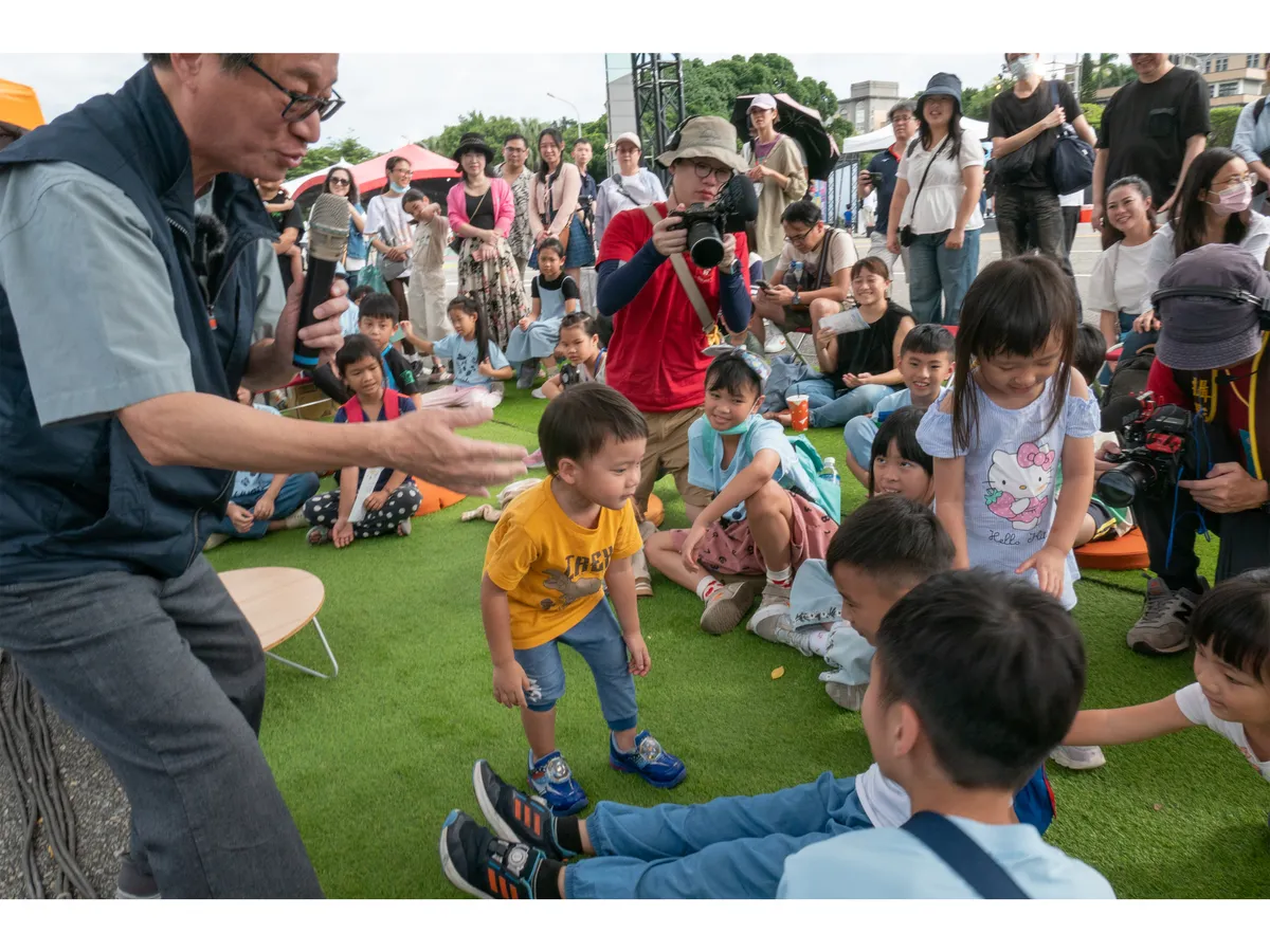 第一站,我們來到了悠遊故事區,在這裡,我們看到繪本裡的故事被不同的方式表達──可以是大人告訴小孩,可以是小孩說給觀眾,甚至也可以不用說的,直接在舞台上扮演、遊戲。小記者們一直在周圍找尋人跟人之間不同的互動狀態,他們一下子拍觀眾、一下子拍說書人,因為,一個故事最讓人著迷的地方,就在於說書人跟讀者之間產生的連結,人與人之間,都是透過故事連結起來的!本區作為第一組攝影作品,也代表小記者用照片說故事,和大家連結起來!
