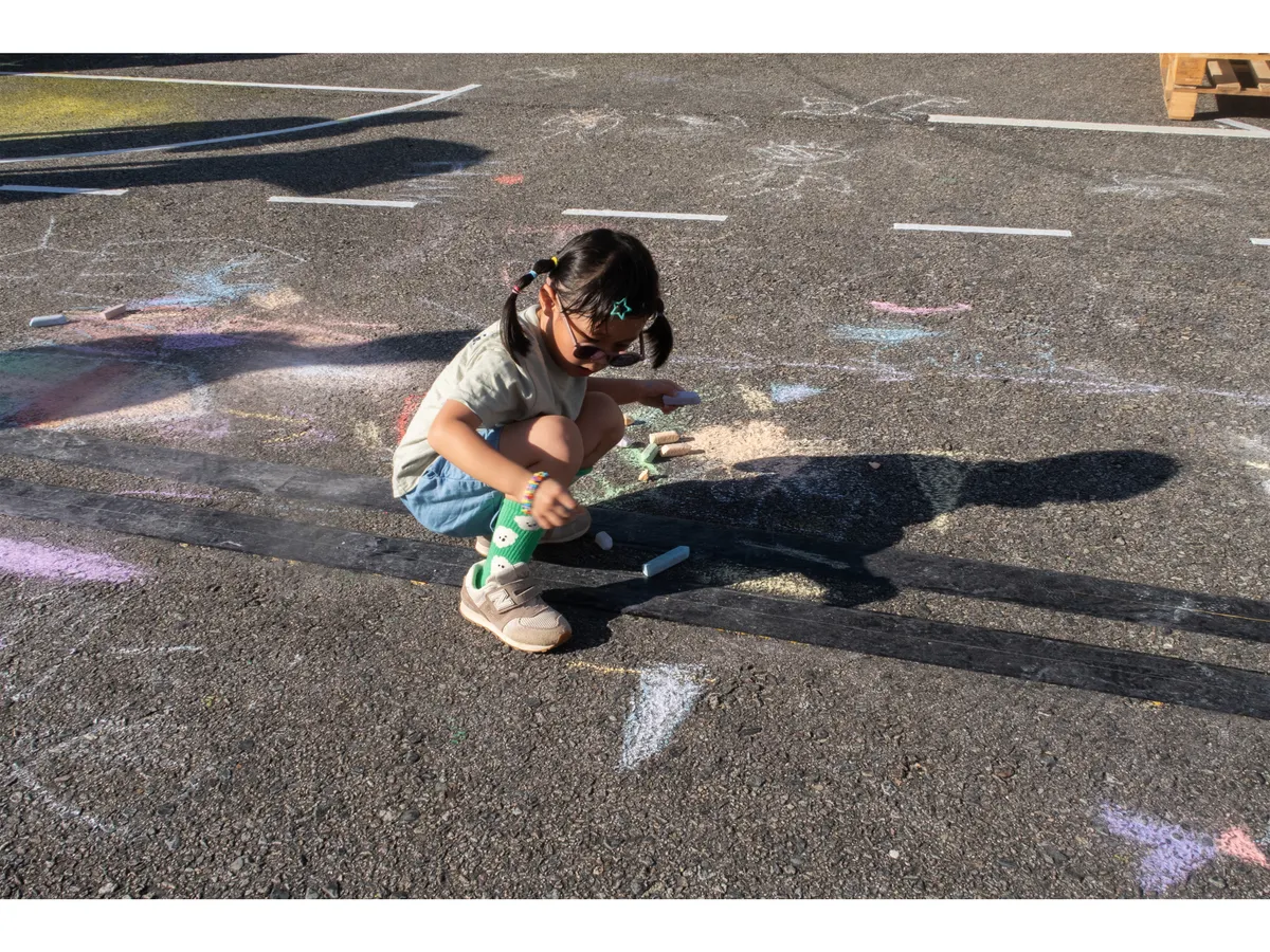 「以前在馬路上全部都是汽車,現在竟然有這麼多小朋友一起在這裡玩樂,甚至畫畫,」楊晴瑜特別點出,「馬路」跟「玩樂」在她的經驗裡是彼此衝突的關係,反映出台灣社會的現況。攝影正好可以藉由拼湊畫面的元素來表達這樣的衝突,在小記者的照片中,我們就能看到馬路與玩樂拼貼所帶出的違和感。