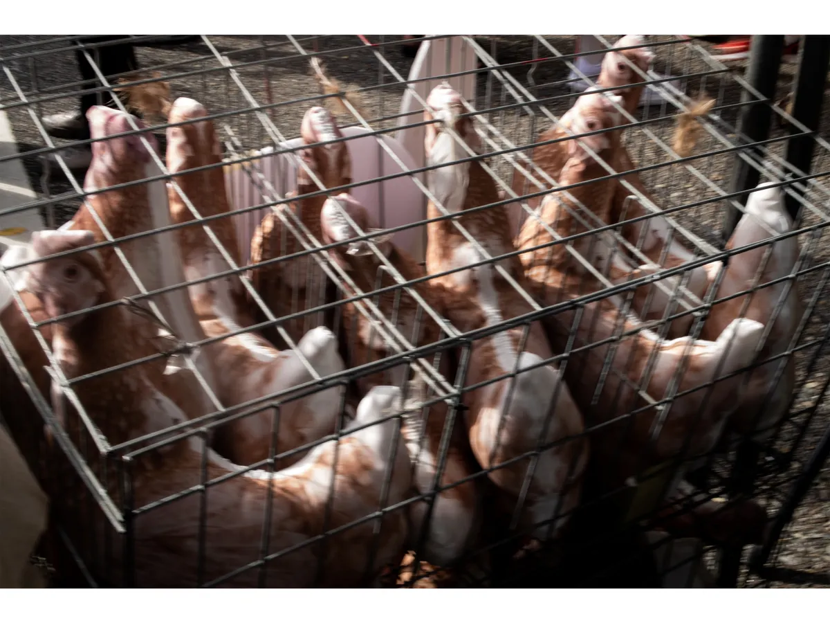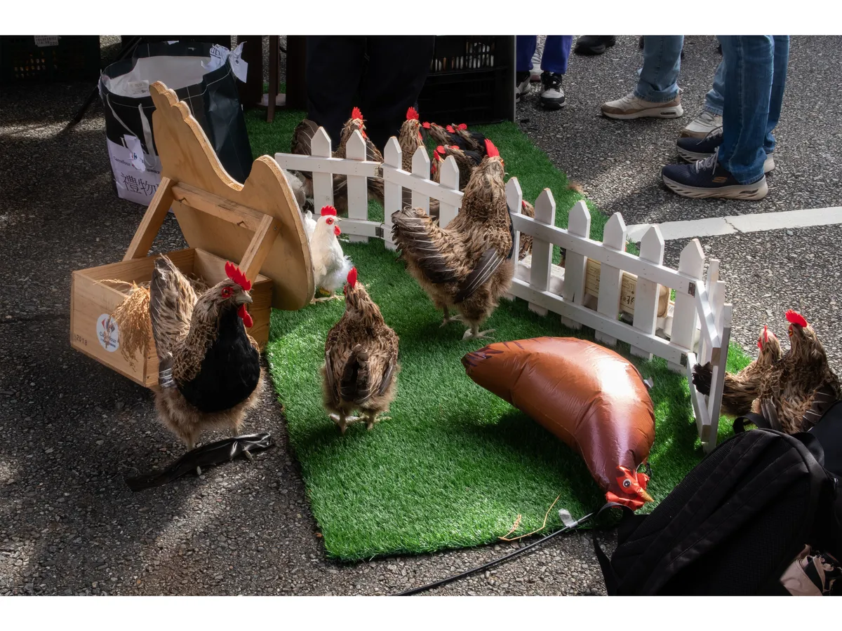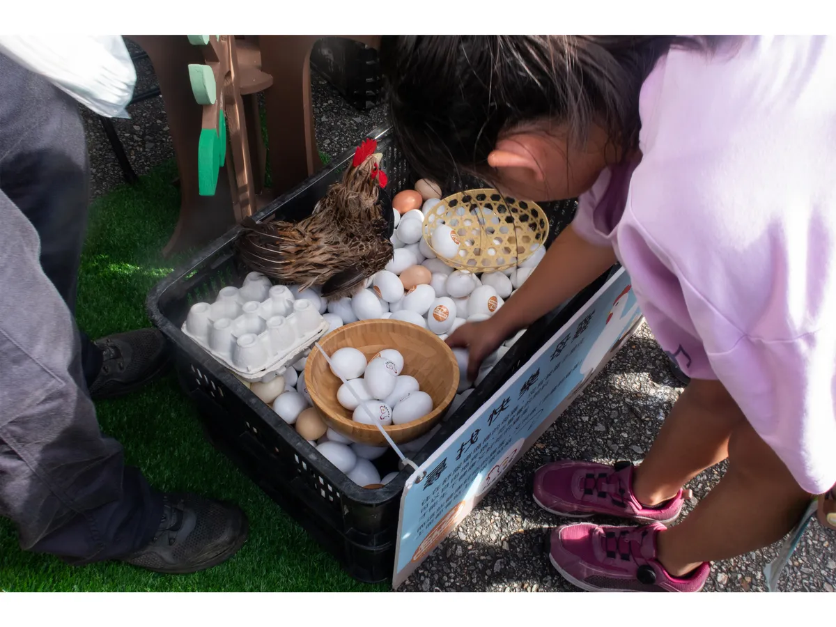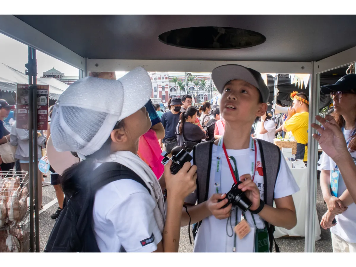 來到樂福美食廣場,有各種美食攤販,小記者們很快地鎖定了介紹一家「雞」的攤位,這間特別的店設置了黑壓壓的箱子,裡面藏了幾隻雞,原來,我們平常所吃的雞蛋,是在不自由的籠子裡成長。小記者楊晴瑜把籠子的「陰暗」用低曝光拍攝出來,也把雞在籠子裡的恐懼、焦躁,利用「晃動」的方式表現,最後,也把正在用餐區的人群捕捉下來。透過一系列照片的編排,提醒在場的人,在餐桌前,我們有時會成為無知的共犯,動物的權利需要大家一起來關注!