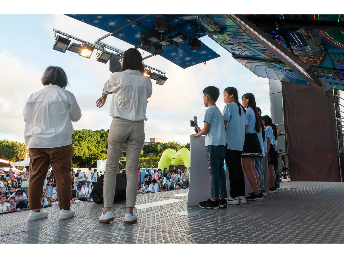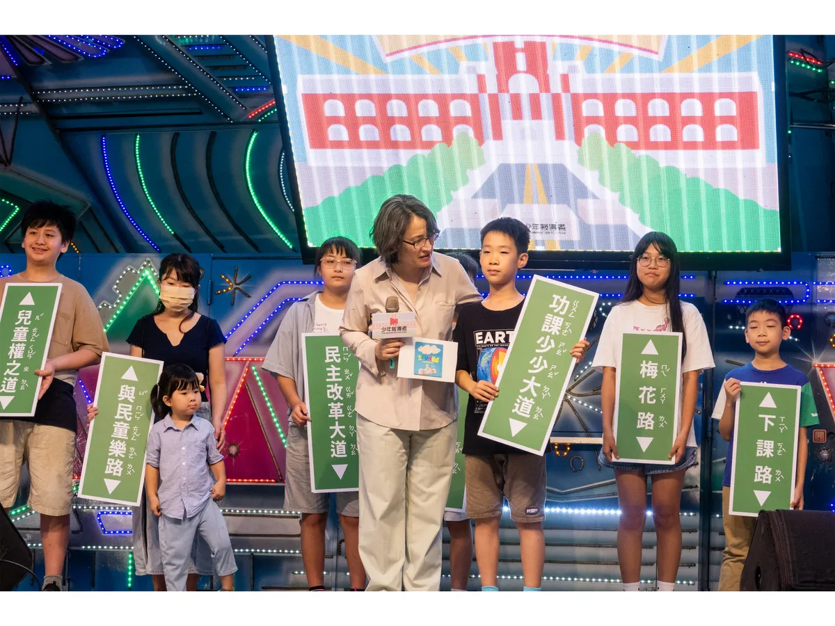 在最後的廣場舞台區,是《少年報導者》企劃的「街頭議會」,台上有嘻哈歌手老莫ILL MO與國中七年級女兒莫雅欣的表演、有各地高中生對於教育體制的看法,還有苗栗苑裡鎮的學生分享參與式預算的成果。而壓軸的重頭戲是「凱道命名活動」,小朋友自己提名、在現場進行票選,台北市長蔣萬安親臨會場,聽同學分享命名的原因,並由副總統蕭美琴揭曉最後的票選結果。