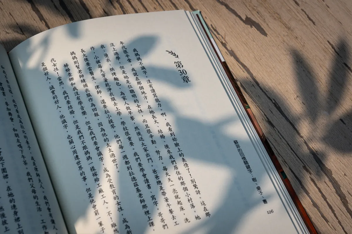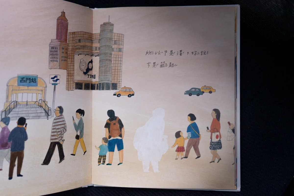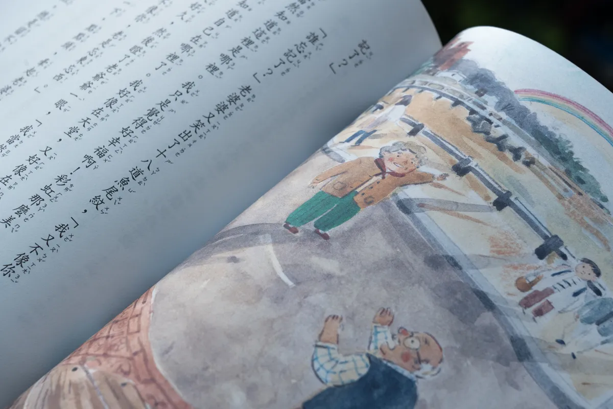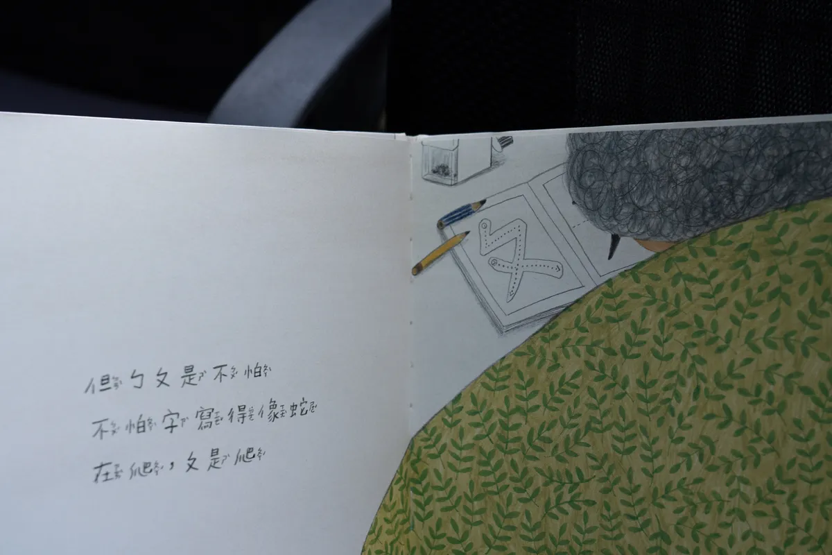 仔細看圖畫,會發現故事前大半段的阿媽只有背影和局部身體,看不見她的臉,也沒有表情,彷彿她對自己的忽視,也反映了那個時代對這群女性的漠視。直到老年,阿媽開始學注音符號,那是她對自由和尊嚴的渴望。畫面中,她的側臉慢慢被看見;最後,阿媽與孫子一起學習,終於露出正面的笑容──開心而滿足。