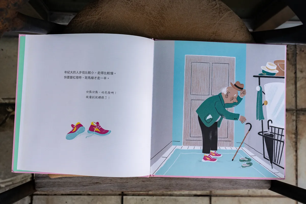 這本繪本透過對長者的外在觀察與內心對話的交錯,讓讀者既能理解身體的變化,也能感受長者當下的心情。例如,書中描述老化的身體狀態:「年紀大的人步伐比較小,走得比較慢。快要變紅燈時,斑馬線才走一半。」同時,畫面也傳遞長者的心聲:「快點快點,好危險啊!被撞到就糟糕了!」藉此能多一點理解他們的真實處境。