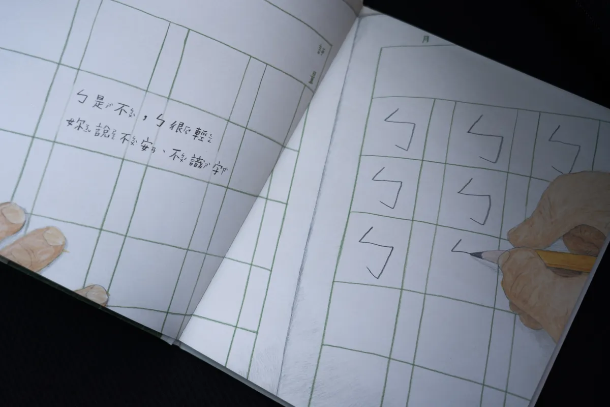 阿媽那一輩的女性活得堅強又安靜,生活中的委屈經常吞進肚子裡。但生命裡總有些遺憾,需要我們仔細聆聽,共感他們的傷痛。繪本《注音練習》有趣的將注音ㄅ到ㄦ融入詩句,講述一位不識字的阿媽,生長在重男輕女的時代,幼年失學,甚至被賦予賺錢貼補家用的責任。結婚後她為家庭奉獻,直到子女成人離家,她獨自生活。生活逼著阿媽前進,教育機會一再錯過,不識字,成了阿媽的秘密,也是心中的痛。