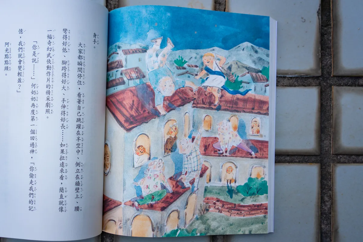 當奶奶談論夢想,說起人生風浪時,圖中乘風飛翔的鞦韆似乎變成揚帆出發的船隻,隨著回憶遨遊四海。閱讀時,不妨放慢速度,看看當中圖文互動的幽默與哲思,像是奶奶說起關於「從心所欲」的自由度差異時,看看娃娃和奶奶會發生什麼事情?一旁的姊姊又是什麼心情?對比右跨頁正要豪氣購買氣球的老婦人,恰巧能讀出圖文合奏的趣味。