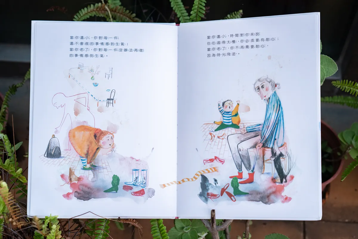 本書的圖文搭配充滿巧思。奶奶說:「小時候,你對每一件你還不會做的事情感到生氣;當你老了,你對每一件你沒辦法再做的事情感到生氣。」圖畫裡,小弟弟正為了還不會自己穿鞋,氣得握拳抗議;奶奶則是坐在矮凳上,用鞋拔輔助穿鞋,因為她沒辦法再像孫女一樣,輕鬆彎腰穿鞋。