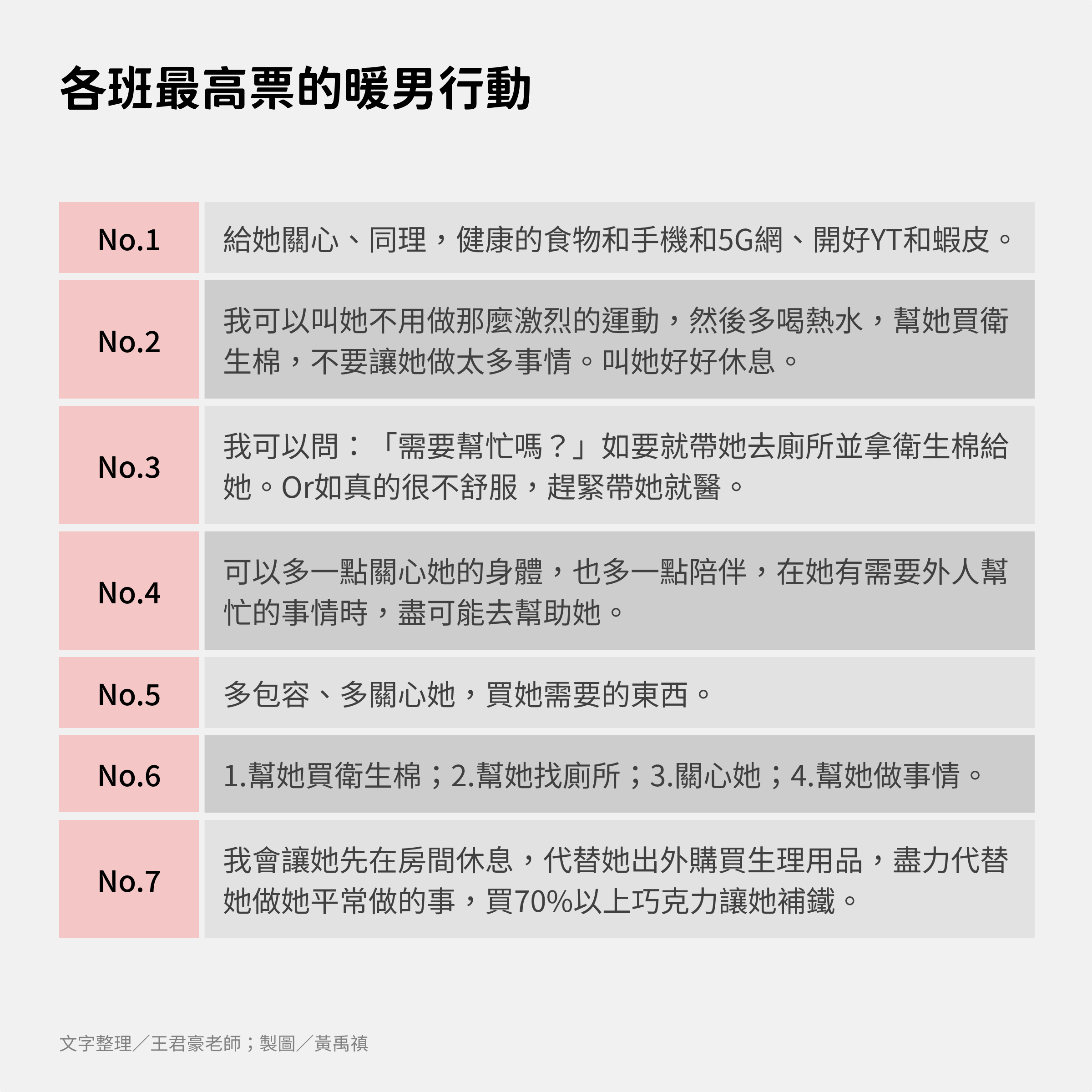 進入各班評選階段,每張小卡隨機以暖男練習生的編號標記,學生匿名投票選出心目中的最佳提案,選出能順利出道的暖男代表。雖然只有女學生的票數決定最終結果,但男學生的參與也至關重要,不僅讓他們能觀摩其他班級的觀點,還能預測女孩們期待的月經友善行動,從中深化對月經平權的認識。