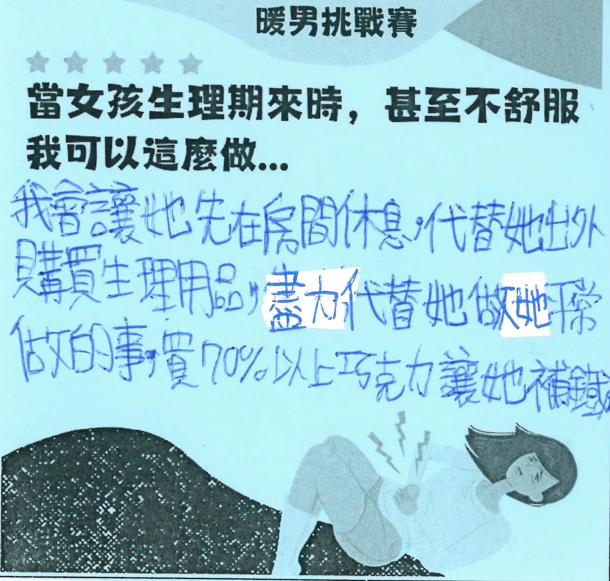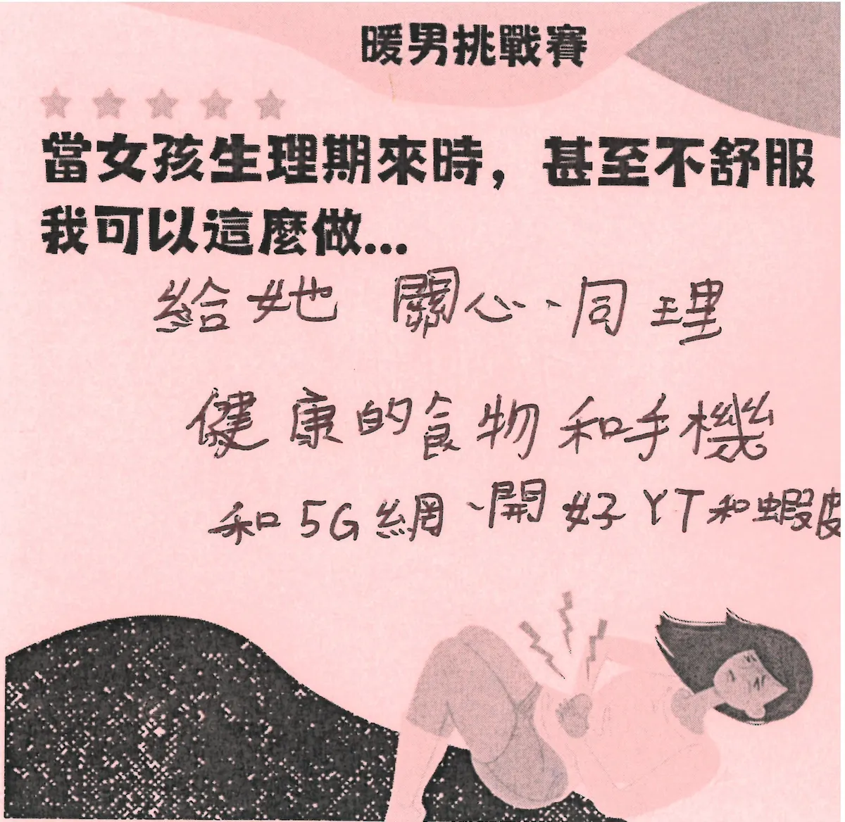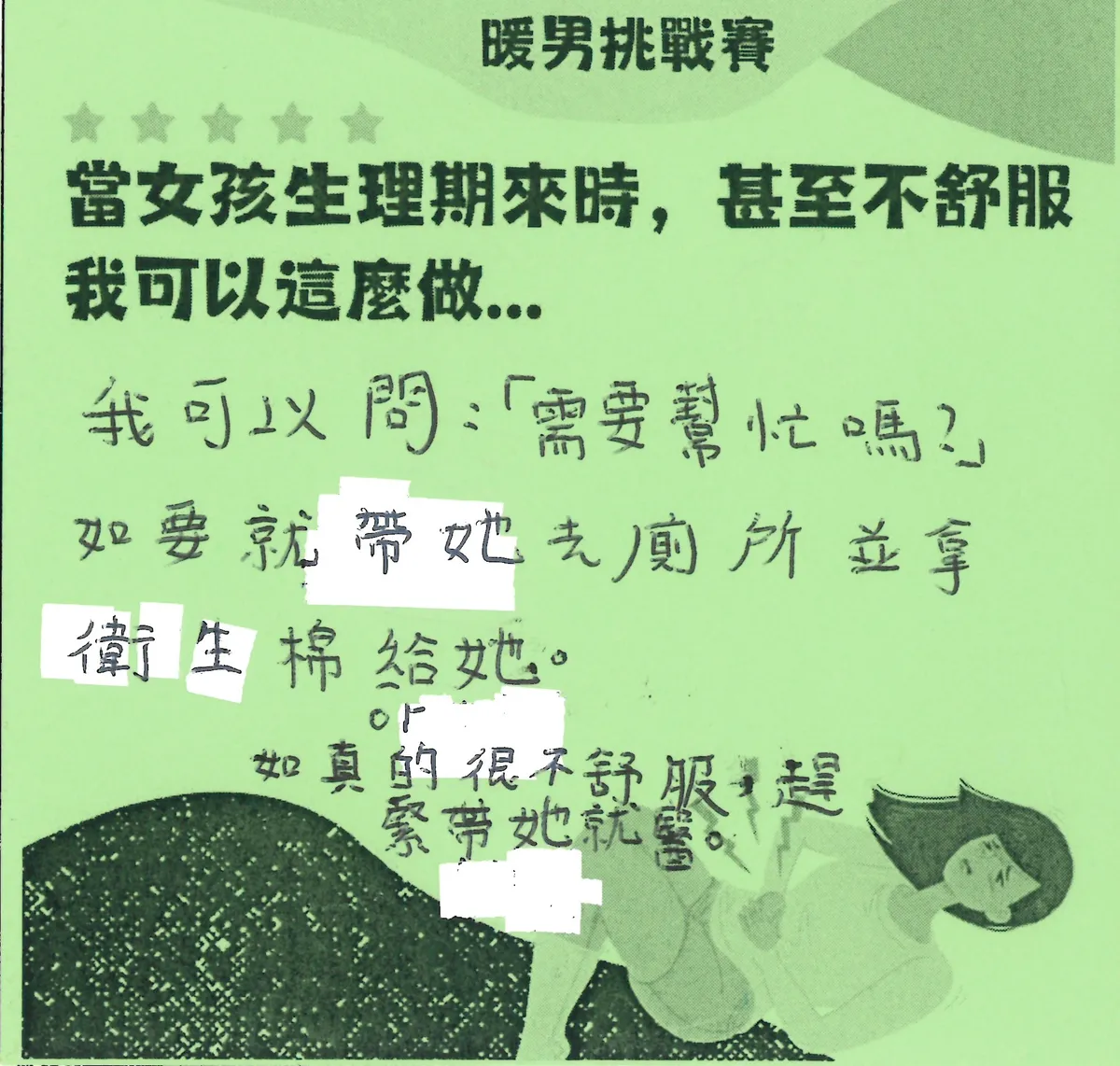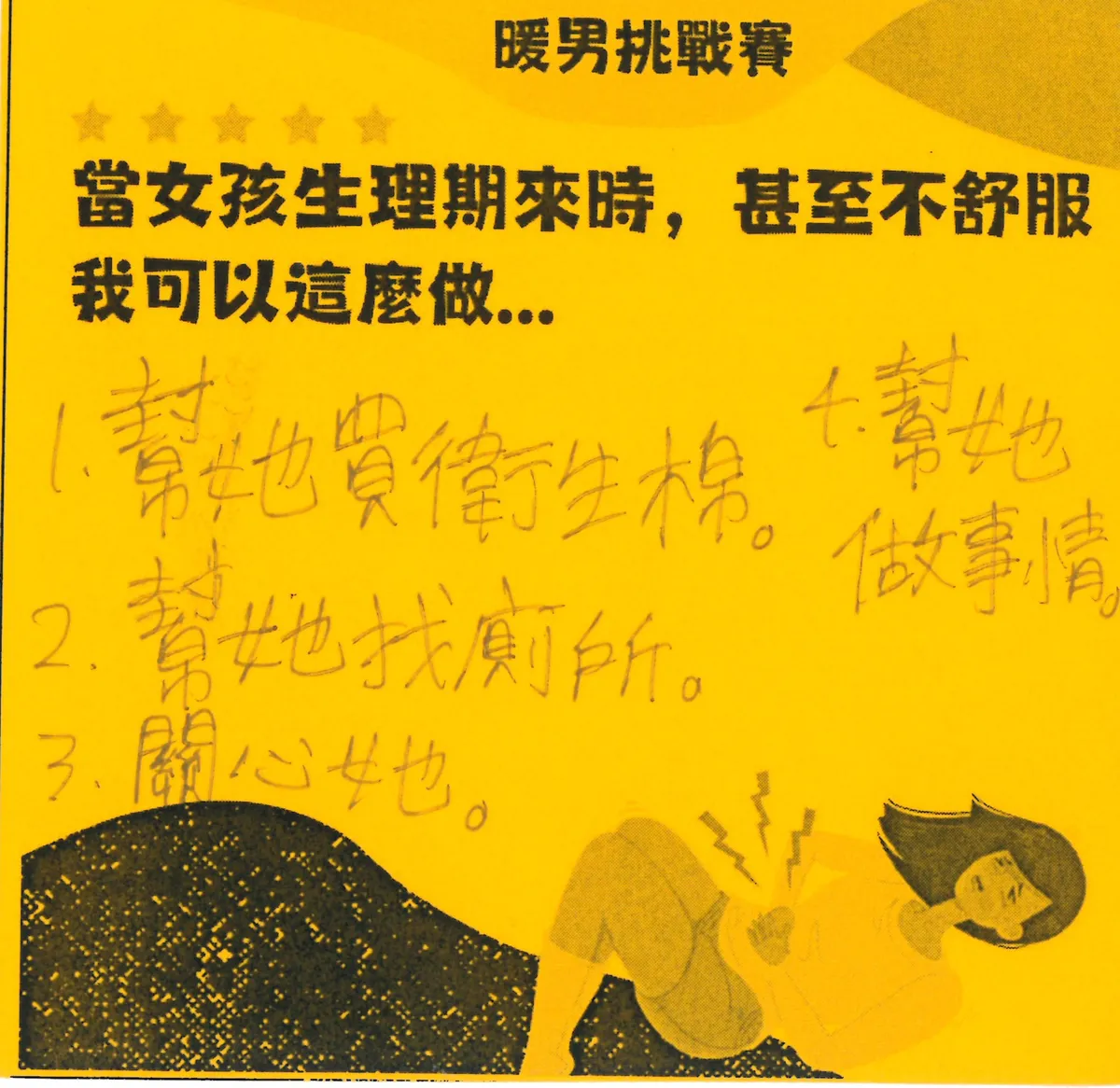 這學期我設計了一項「暖男挑戰賽」,它是一個幫助男學生接觸月經議題的核心活動,男生接受挑戰的同時,女生則針對不同的月經迷思、歧視及汙名,填寫「翻轉小紅卡」,為自己發聲。