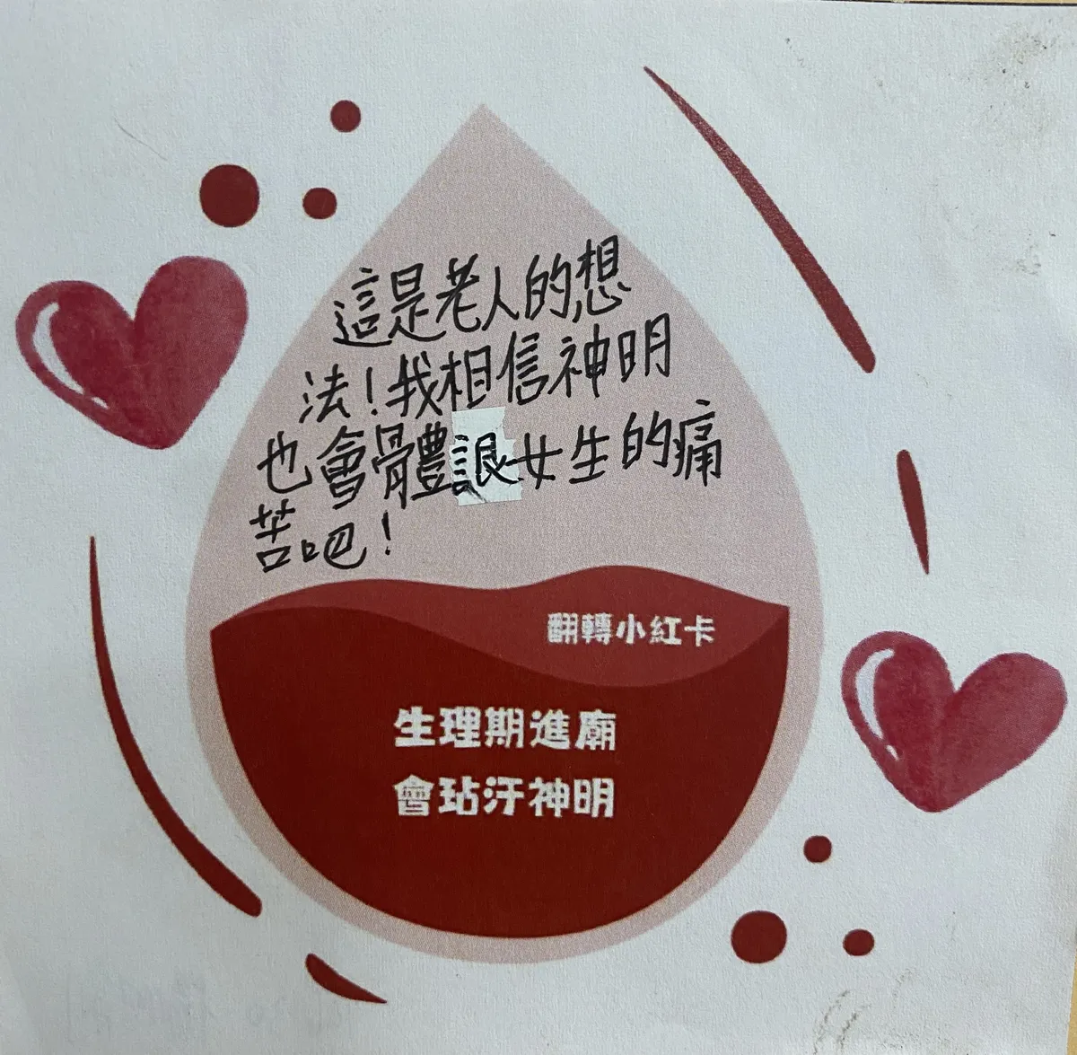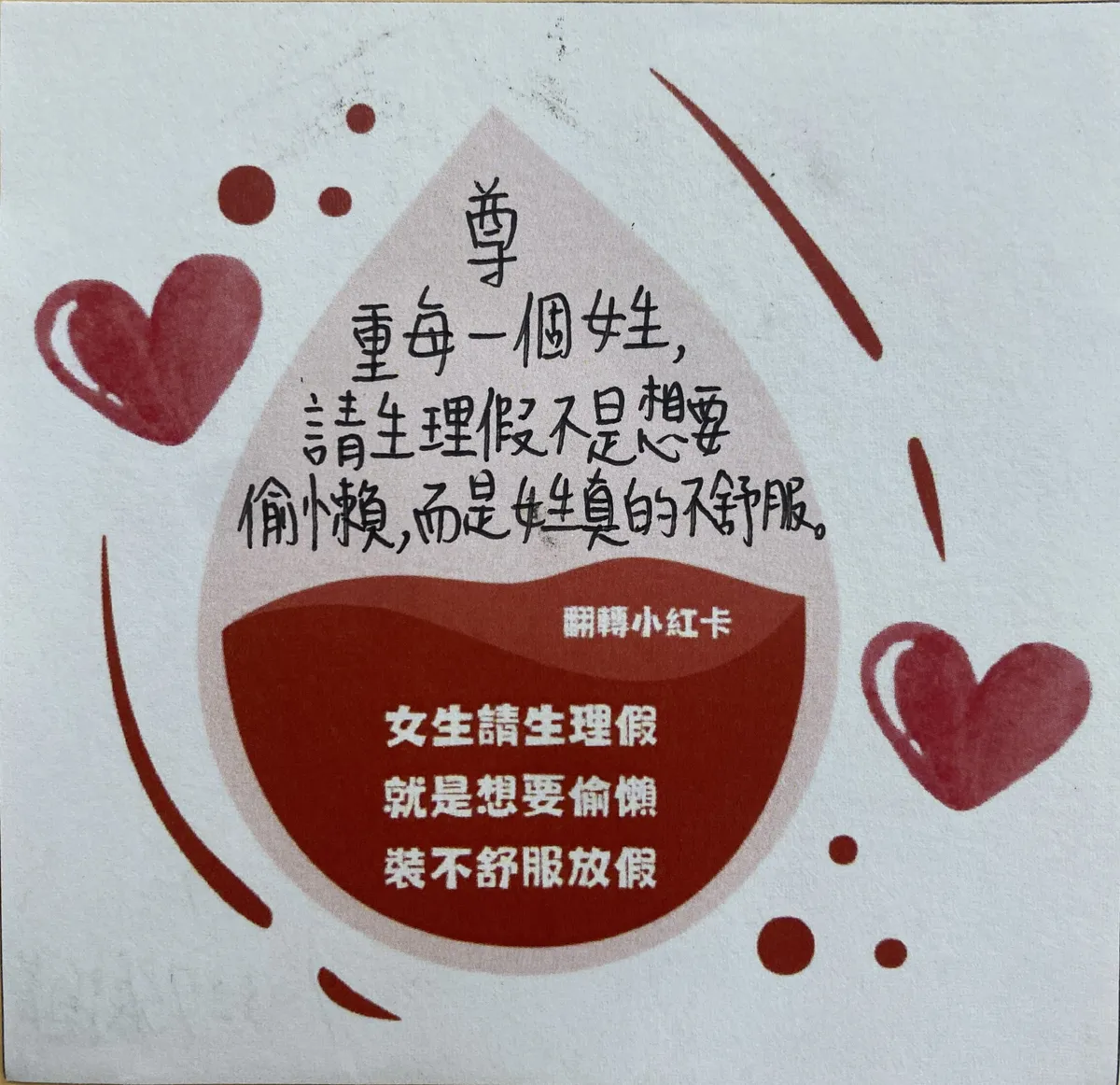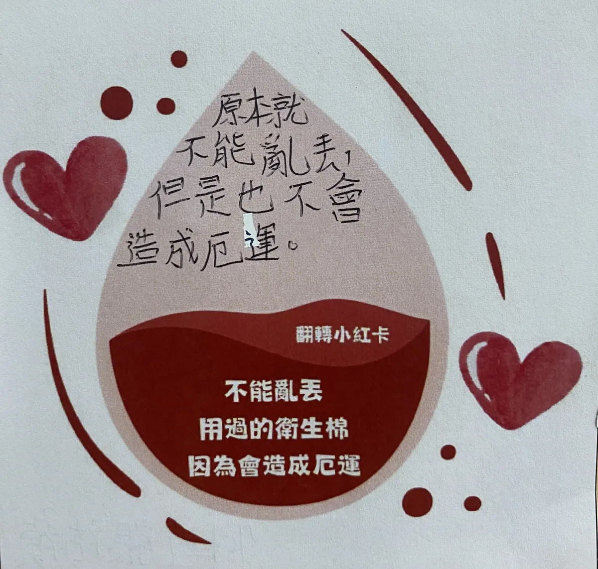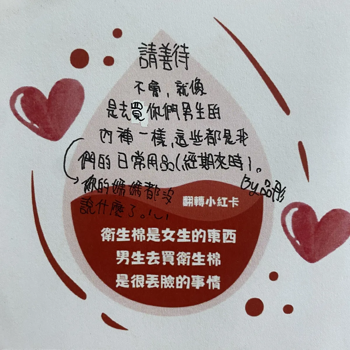 這學期我設計了一項「暖男挑戰賽」,它是一個幫助男學生接觸月經議題的核心活動,男生接受挑戰的同時,女生則針對不同的月經迷思、歧視及汙名,填寫「翻轉小紅卡」,為自己發聲。