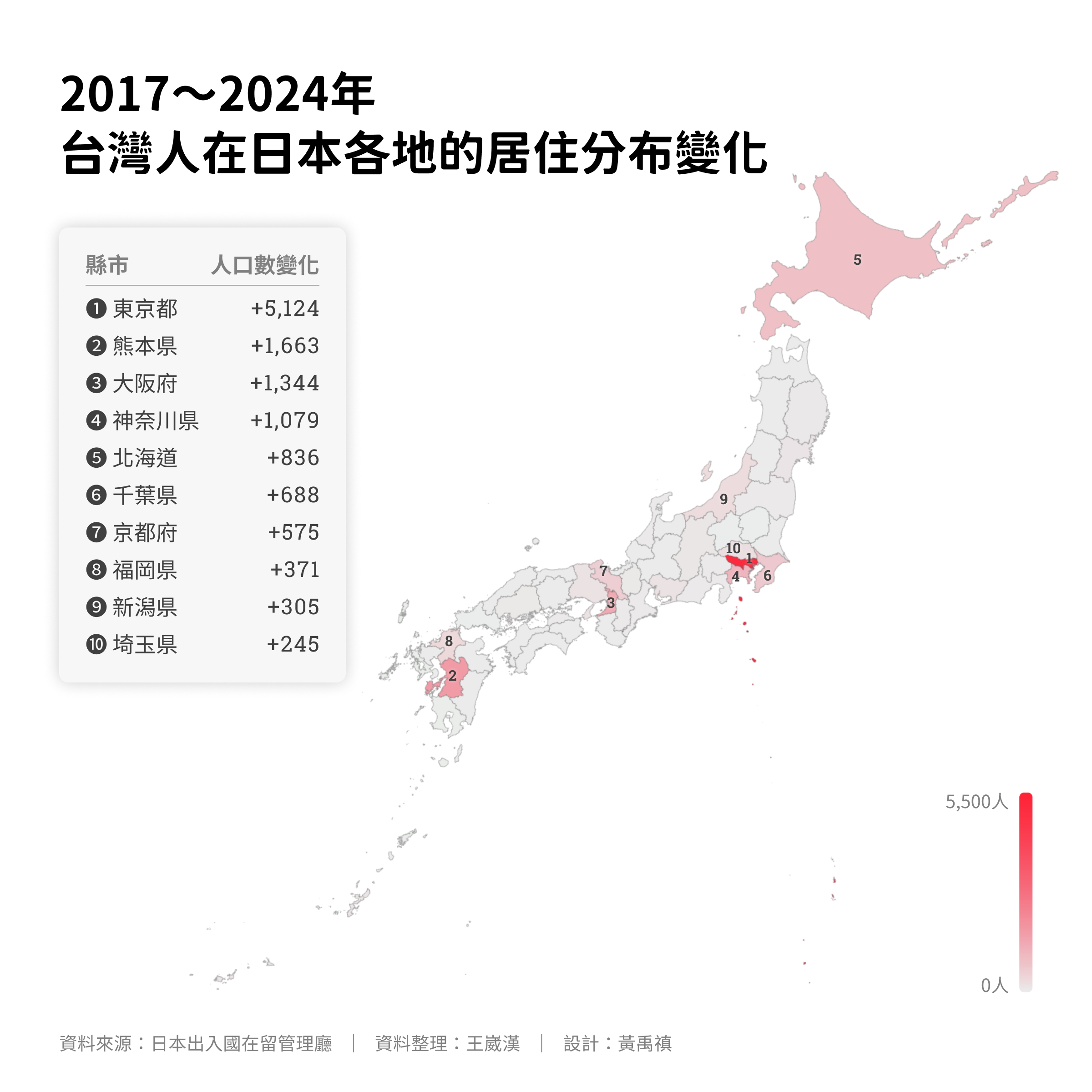 根據日本出入國在留管理廳公布的數據顯示,從2017年到2024年,台灣人在日本的居住分布出現明顯變化。雖然大多數台灣人還是集中在核心城市,尤其聚集跨國企業與新創公司的東京,依舊是台灣人的首選,但另一個亮點是熊本縣,7年間多了1,663人,是人口成長幅度第二大的地區。