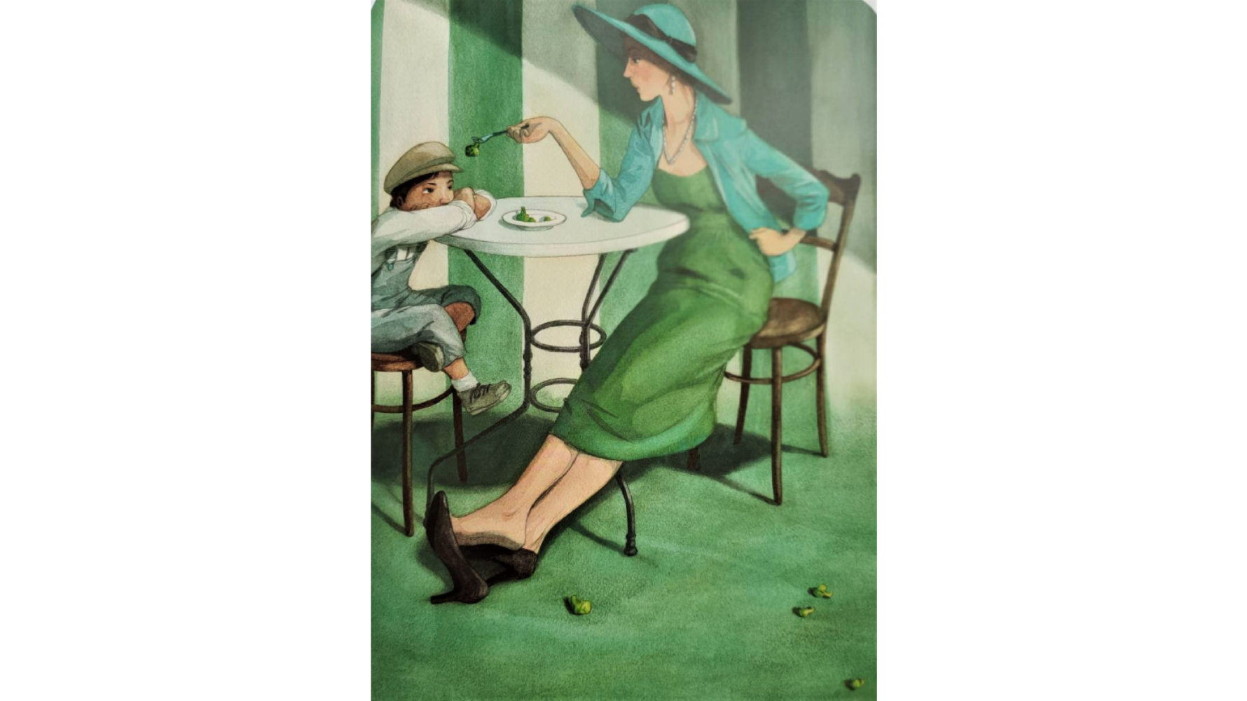 在比利時知名作家兼編劇海倫娜.德爾福格(Hélène Delforge)與插畫家昆汀.葛利本(Quentin Gréban)合作的《母親》中,以短文故事搭配寫實的筆觸,描繪世界各地不同族群32幅母親與孩童的姿態。有帶著孩子努力工作的母親、也有讓孩子踩踏在自己腳上的母親、擁護自己夢想卻又要兼顧孩子的母親,還有穿著時髦正緊盯孩子吃東西,語帶不耐煩地對孩子說「不管要耗多久時間就是要你吃完!」的焦慮母親。