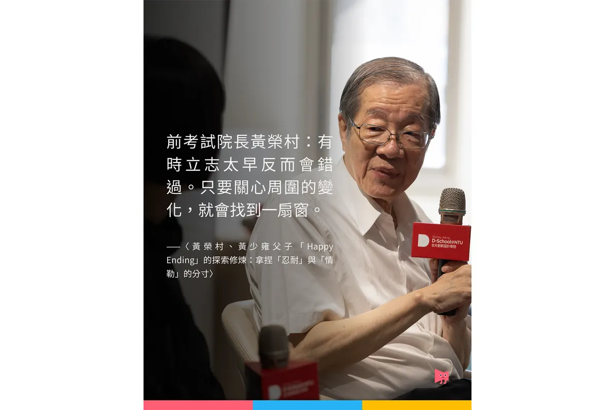 《少年報導者》與台大創新設計學院(D-School)繼「探索,從零到無限大—從課堂到人生的破框行動」跨世代的探索分享講座後,11月8日再由《少年報導者》策畫的《我的14歲》系列對談延伸合作「青春試煉與未來實踐」講座,除邀請曾任考試院院長、教育部部長的黃榮村與其音樂製作人兒子黃少雍的父子對談,還有台大D-School的學生陳思綺、饒舌歌手林達見,分享他們勇敢的青春探索歷程。