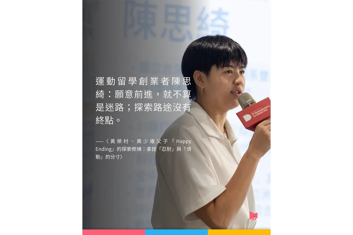 創立「FLUX」(Flux Athletic Compass)後,她分享留學與運動心理健康,希望陪伴運動員走出迷惑。「我的人生是起起落落落落落,但我學會不怕從頭,願意前進就不算迷路,我的探索路途,沒有終點。」