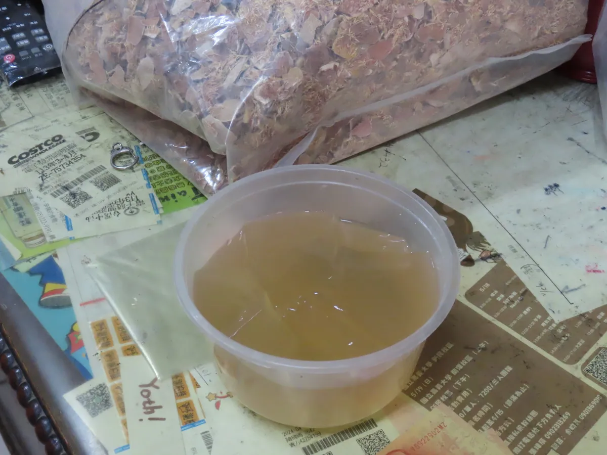 親切的老闆娘也讓我們實際體驗「洗愛玉」的過程:先用含有礦物質的水清洗一遍,接著用湯匙的尾部刮愛玉,把愛玉仔刮下來,將愛玉仔和水混合榨出汁,冷卻後就是清爽消暑的愛玉。老闆娘也表示,愛玉一直是店裡的熱銷商品之一!