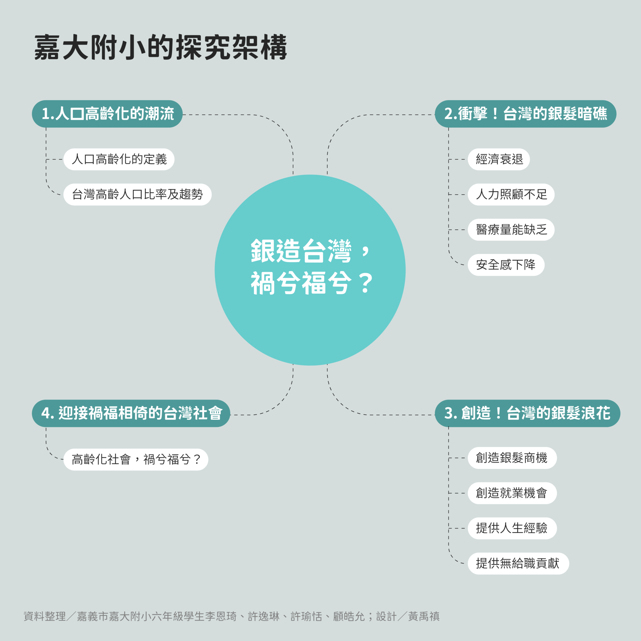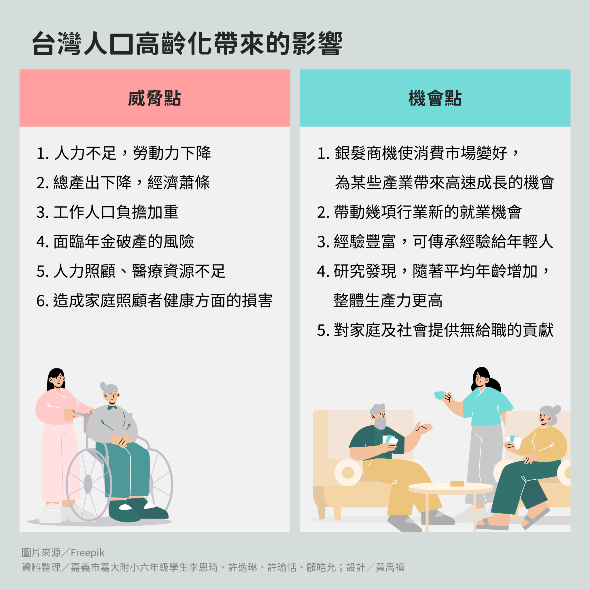 台灣面臨人口老化現象,雖然有好有壞,但許多媒體常將高齡者視為問題或壓力,所以我們好奇人口老化是否只有負面影響?經過探究後,我們發現,人口老化雖然會使勞動力下降、照顧人力不足等問題,但高齡者也會帶來銀髮商機、創造就業機會等影響。人口老化是不可逆的現象,因此,我們要以正面的態度迎向未來!